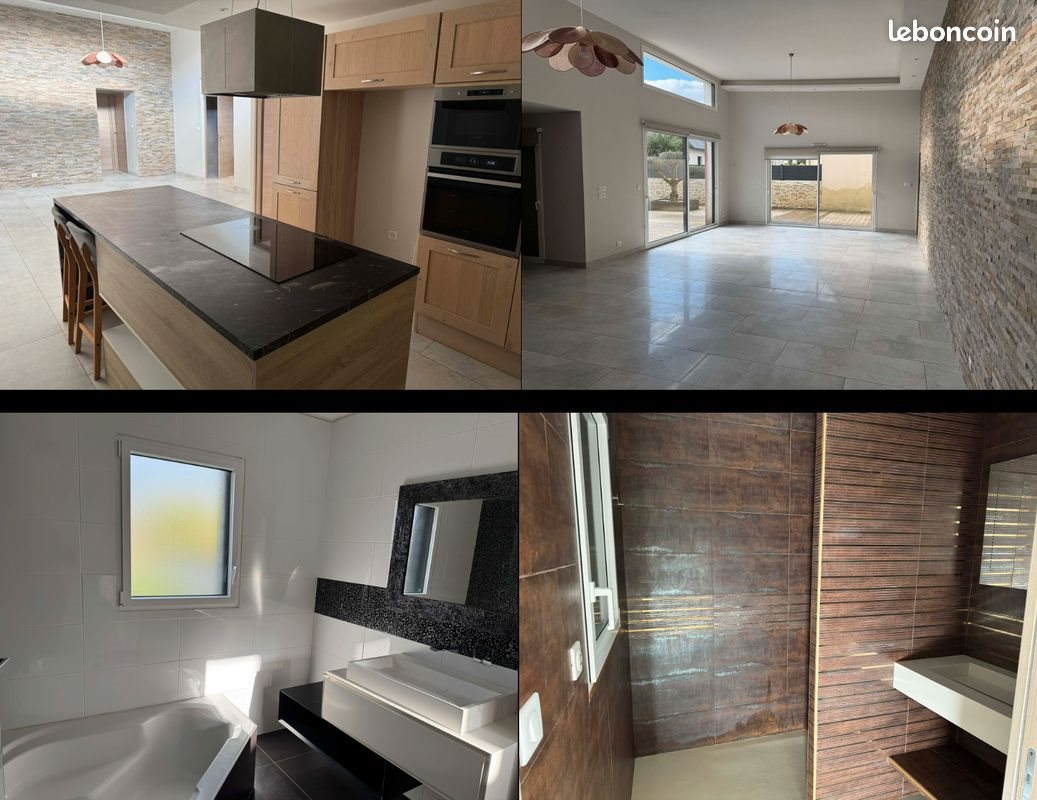 Découvrez cette magnifique maison de plain-pied de 140m2, idéalement située sur un terrain clos de plus de 1000m2, offrant confort, volume généreux et prestations de qualité. La maison se compose de : - 3 chambres, dont une suite parentale avec dressing et salle d'eau privative - 1 salle de bain indépendante - 1 toilette indépendant - 1 pièce de vie de 70m2, baignée de lumière avec une belle hauteur sous plafond, une cuisine ouverte La cuisine, de la marque cuisinella, est équipée d'un four, d'un micro-onde, d'un lave-vaisselle, d'une plaque induction, et d'un plan de travail en granit, alliant esthétisme et durabilité, équipé . A l'extérieur, une grande terrasse vous permettra de profiter pleinement des beaux jours dans un cadre agréable et spacieux. Premier contact par la messagerie du bon coin.