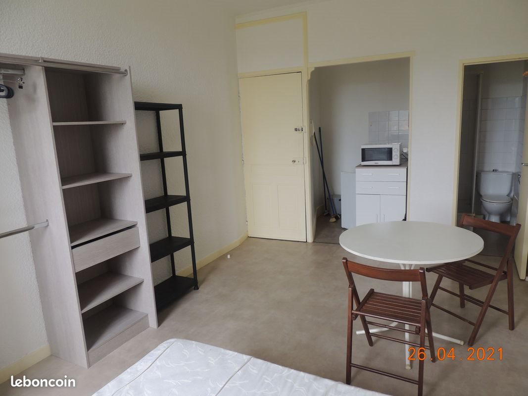 Studio meublé, centre ville, très bon état, douche, wc, coin cuisine ,frigo , plaque éléctrique, micro onde, grand lit, dressing, table ............quartier très calme double vitrage, interphone, parking gratuit très proche libre de suite