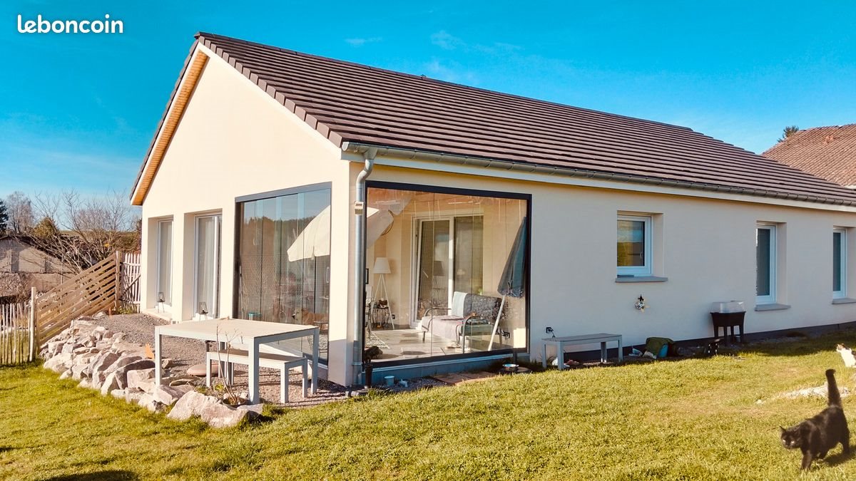 Pour rapprochement familial, je vends ma maison de plain pied neuve. Vous cherchez une maison neuve, lumineuse, très économique en chauffage, située dans un environnement calme et verdoyant, avec une vue panoramique splendide et de belles finitions? Ne cherchez plus et posez vos valises! Dotée d'une grande pièce de vie entièrement vitrée et lumineuse, d'une cuisine équipée très fonctionnelle avec îlot central et coin repas, d'un lave vaisselle placé en hauteur, d'une plaque à induction Bora avec hotte intégrée, d'un réfrigérateur, d'un congélateur, d'un meuble rideau avec tablette télescopique pour cafetière et robot ménager. Vous trouverez 3 belles chambres, avec fenêtres extra grandes, dont une avec un dressing. Côté sanitaire : un Wc suspendu avec meuble lave mains, une salle de bain spacieuse avec une porte fenêtre, une grande baignoire et une douche extra plate de 100/160cm, un Wc suspendu, un meuble lavabo et une colonne, un miroir rond lumineux. Vous trouverez également une buanderie chauffée, pour votre lave-linge et sèche-linge et la pompe à chaleur. La maison comporte un double garage de 47 m², avec porte sectionnelle motorisée et une grande fenêtre. Par le garage, vous accédez à une pièce de 12,5m² chauffée et bénéficiant d'un accès extérieur, pouvant servir de bureau ou d'atelier pour une profession libérale (arrivée d'eau présente). Toutes les menuiseries extérieures sont en Pvc avec triple vitrage, et volets roulants aluminium motorisés. Conduit de cheminée en attente au salon. Chauffage au sol et eau chaude sanitaire par pompe à chaleur air-eau très économique. Eau douce exempte de calcaire. Le petit plus très agréable : le sas d'entrée et la terrasse de 12 m² sont abrités du vent et de la pluie par des vitres coulissantes en verre sécurit permettant de profiter de l'extérieur dès les premiers rayons de soleil! Le terrain entier mesure 1999m². La pelouse principale de 1000m² est gérée par un robot tondeuse. Les abords du jardin sont agrémentés par des enrochements. Important: Prix Par Message Privé Et Visites Uniquement Sur Justificatif De Financement prix justifié par les factures.