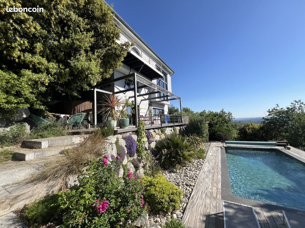 Maison 6 pièces 167 m² Située dans un secteur recherché, cette maison contemporaine d'environ 167 m2 offre un cadre de vie privilégié alliant lumière et volumes généreux. Construite sur une parcelle de 1 500 m2, elle bénéficie d'une architecture moderne avec de larges ouvertures et un pignon entièrement vitré, offrant une superbe vue dégagée. Le premier niveau comprend une vaste pièce de vie lumineuse avec cuisine équipée ouverte, donnant sur une terrasse offrant une vue panoramique. Le niveau N-1 dispose de trois chambres, d'une salle d'eau et de toilettes séparées. Au niveau N-2, un studio indépendant d'environ 50 m2, avec cuisine pouvant servir de cuisine d'été, salle d'eau et chambre, offre un espace polyvalent. Il communique avec la maison mais peut également être totalement indépendant. Cet espace s'ouvre sur une grande terrasse avec accès à la piscine maçonnée de 8 m x 3,40 m recouverte de mosaïque La maison est équipée d'un système de chauffage par climatisation réversible et d'un poêle à granulés. Elle dispose également de panneaux solaires d'une puissance de 9 kVA Caractéristiques principales : o Surface habitable : 167 m2 o Terrain : 1 500 m2 o Pièce de vie avec cuisine équipée ouverte o 3 chambres + studio indépendant avec cuisine et salle d'eau o Piscine maçonnée en mosaïque (8 m x 3,40 m) o Chauffage : climatisation réversible + poêle à granulés o Panneaux solaires (9 kVA) générant 750Eur de revenus annuels o Grandes terrasses o Vue dégagée o Abri en bois de 15 m2 Taxe foncière : 1420Eur Les informations sur les risques auxquels ce bien est exposé sont disponibles sur le site Géorisques : Surface : 167 m² Date de réalisation du diagnostic énergétique : Consommation énergie primaire : 118 kWh/m²/an Consommation énergie finale : 60 kWh/m²/an Montant estimé des dépenses annuelles d'énergie pour un usage standard : entre 1 550 € et 2 150 € sur les années 2021, 2022 et 2023 (abonnements compris).