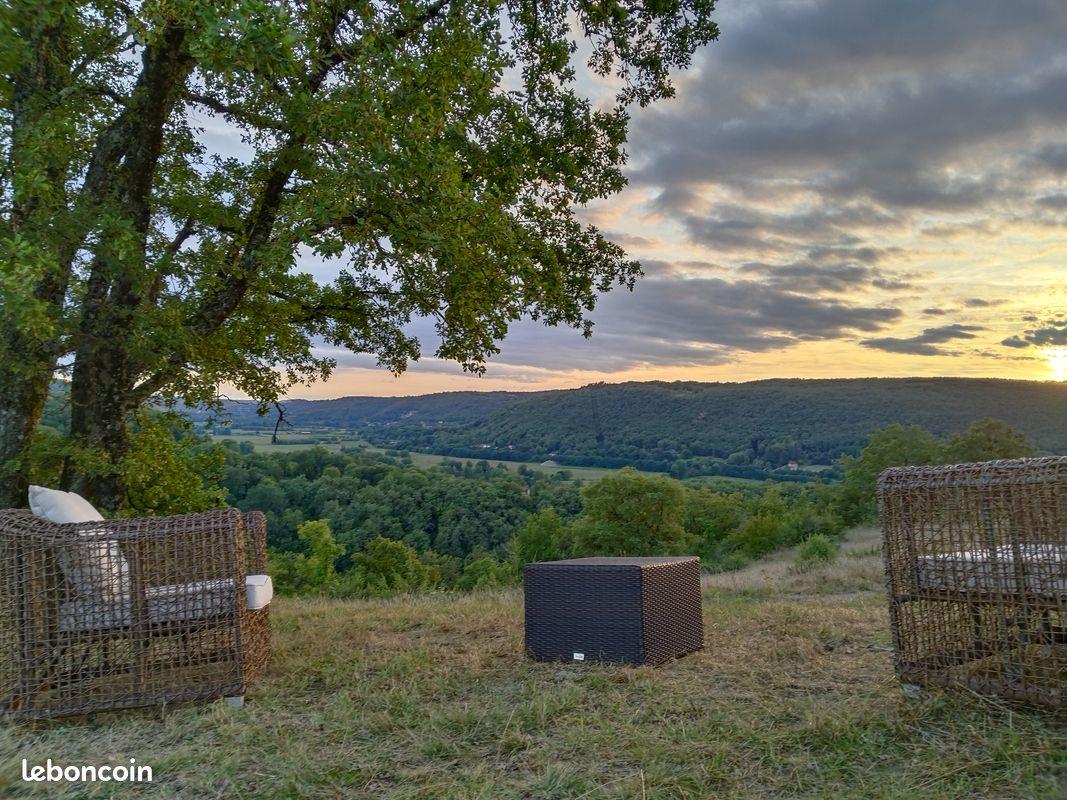 Jolie maison en pierre, au sein d une propriété (ma maison ) ou le calme et la nature regnent , vous pourrez profiter de vues exceptionnelles sur la vallée du Lot et laisser courir votre imagination . Un potager sera mis en place a développer en commun et un poulailler l idée à terme étant de se rapprocher le plus de l autonomie en generale. Je precise qu il n y a aucune obligation d y participer. Descriptif : A l etage d une grange ouverte qui sera votre terrasse couverte. se trouve l' appartement . L' entree se fait sur un petit palier avec a sa gauche la salle d eau wc. La piece principale de ce studio de 44 m est : a gauche la cuisine ( cuisine equipee lave linge four plaque frigo et ustensiles), a droite le salon cheminee et dans la continuité la chambre ouverte (literie neuve 160 ) ,avec un espace bureau. Internet bon debit 2 a 3 mega fibre possible Il vous est fortement conseillé de pratiquer le chauffage bois pour le chauffage l hiver. L eau est comprise dans les charges