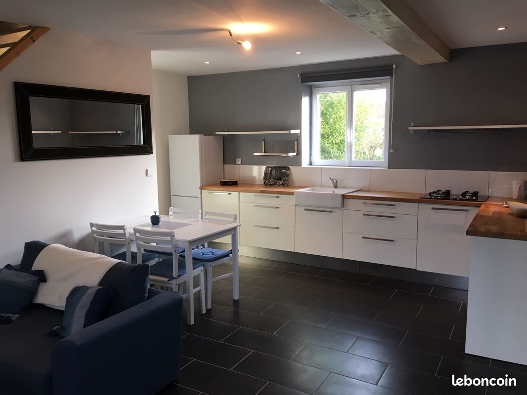 A louer meublé en duplex composé d'une cuisine ouverte, d'un espace salle/salon, dune salle de douche l'italienne, d'un Wc séparé et d'une chambre l'étage (lit double en 140 avec commode) Canapé, table de salle avec 4 chaises, cuisine équipée (four, micro-onde, plaques au gaz, frigo/congélo, cafetière ...), machine à laver, téléviseur, Wi-Fi . Parking 1 voiture et petit jardin à l'abri des regards (salon de jardin) charges comprises (eau, électricité, Wi-Fi) Nota : ce bien Ne Peut Pas être loué en tant que résidence principale. Il convient pour des personnes en déplacement ou formation professionnelle.