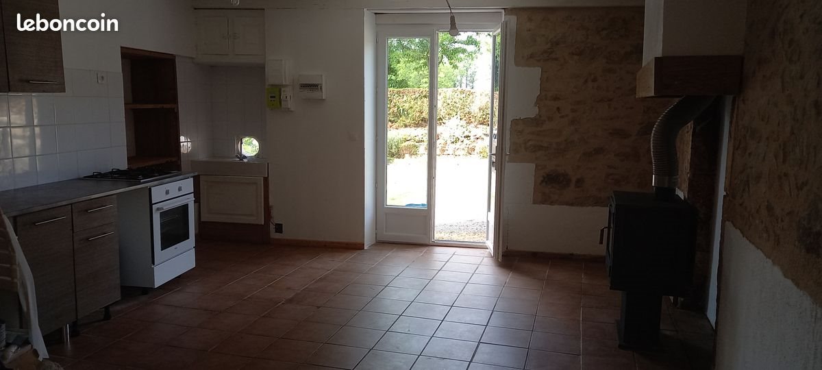 Maison de charme en pierre et poutres apparentes. Chauffage au bois et/ou électrique. Cuisine avec placard étagères ainsi qu'une plaque au gaz et un four électrique. Cuisine commune avec le séjour. Une chambre et un toilette au rez-de-chaussée. A l'étage une chambre mansardée ainsi qu'une salle de douche. Une place de parking, pas de terrain. Maison dans un lieu-dit calme à proximité de Confolens et Chabanais, école et commerce.