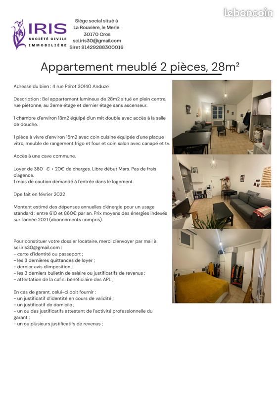 Je loue cet appartement meublé de 2 pièces d'une surface de 28m² situé au 3ème étage d'un immeuble de 3 étages à Anduze. Cet appartement comprend 1 chambre équipée d'un lit double et un accès à la salle de douche. Il dispose également d'une pièce de vie avec une cuisine équipée, un coin salon avec canapé et Tv. - Cave - Cuisine ouverte L'appartement est situé en plein centre-ville d'Anduze. Chauffage électrique individuel. Classe énergie E - Classe climat B. Loyer de 380 € + 20€ de charges. Caution d'1 mois demandée à l'entrée dans les lieux. Appartement disponible à partir de mars 2026. N'hésitez pas à me pour plus d'informations ou pour organiser une visite.