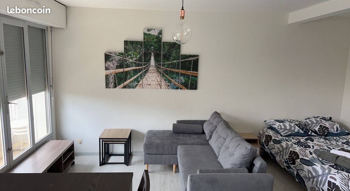 Joli studio meublé dans le centre ville de Cusset. Il est situé dans une résidence sécurisée par badge à l'entrée, entre la Poste et les rues de Cusset. Le studio est loué méublé avec un lit 2 personnes, un canapé d'angle, tables gigognes, meuble Tv (sans télé), table de cuisine haute avec 4 chaises. La cuisine contient une plaque induction, un four micron onde, un frigo, meuble pour ranger la vaisselle ( possibilité de fournir la vaisselle). Placard encastré avec 3 portes. Meuble à chaussures dans l'entrée avec miroir, salle de bain avec baignoire, vasque et meuble sous vasque. Le Wc est séparé. Il y a aussi un placard dans l'entrée. Dans les charges sont compris le chauffage (collectif) et l'eau. Petit chauffe-eau dans la salle de bain. Petite terrasse pour mettre une petit table et de 2 chaises. Il y a une prise fibre ( abonnement non compris ou rajouté 20€ par mois sur le loyer pour le laisser). Loyer 450€ avec charges (370€ + 80€ de charges : régularisation annuelle). Prévoir un abonnement électrique ( environ 40€ par mois) pour la consommation du chauffe-eau et des appareils électroménagers. Tous commerces à proximité. Lycée Albert Londres ou lycée Valéry Larbaud à 20 min à pied et 5 min en voiture. Ifsi à 30 min à pied et 10 min en voiture. Possibilité de visiter à compter du 20 avril et disponible au 01 juin. Un mois de caution à l'entrée. Pas de garantie visale