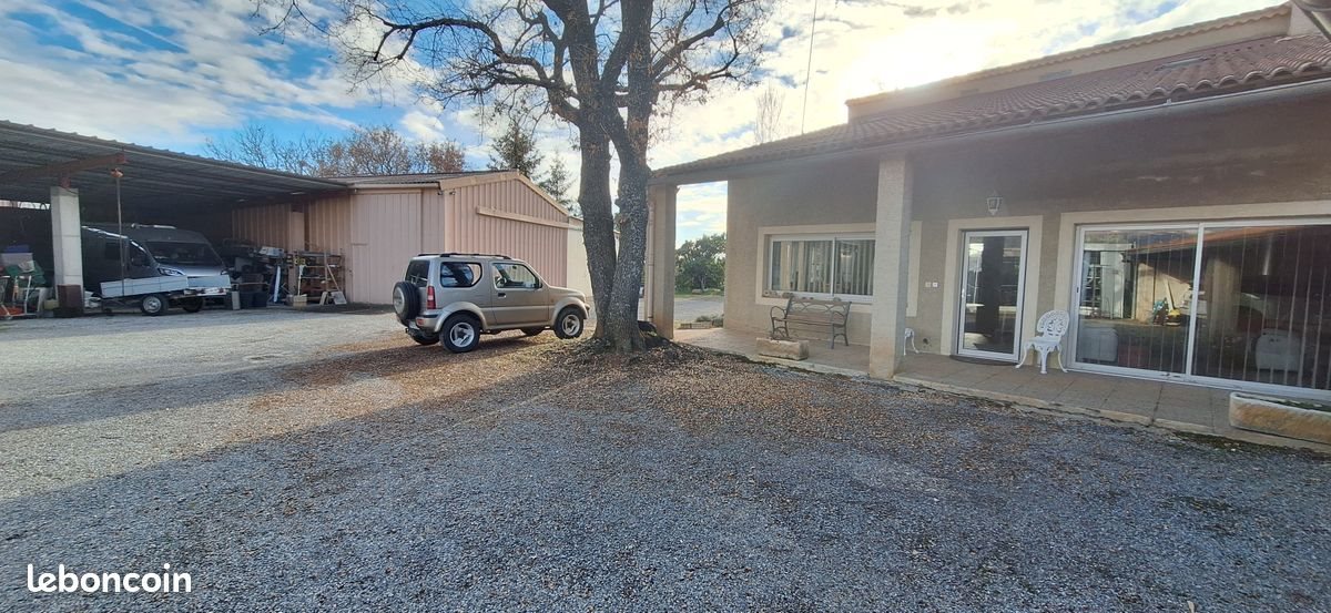 Maison de T4 200 m² avec dépendances de 400 m² sur un terrain de 2500 m² Maison : Rdc : - cuisine aménagée ouverte sur une salle à manger, donnant toutes les deux sur une terrasse semi-couverte - pièce de vie de 45 m² avec poêle à bois et climatisation réversible - une pièce attenante pour chaudière et dressing - Wc - 2 caves avec accès intérieur A l'étage : - 3 chambres dont 2 donnant sur une véranda, - 1 salle d'eau aménagée, - un Wc indépendant, - une buanderie/dressing sous combles de 27 m² Fenêtres en double vitrage et volets roulants électriques. Chauffage central au fioul avec cuve enterrée de 2000l Dépendances : - trois hangars fermés : - un de 120 m² avec une mezzanine, - le second de 127 m² avec une fosse poids lourds avec réservation et une mezzanine - un troisième de 36 m² - deux abris véhicules : un abri voitures de 70 m² et - un abri pour poids lourds de 120 m² - une construction en parpaings de 38 m² possibilité d'aménagement en habitation ou bureau (arrivée et évacuation d'eau et volets roulants électriques) - Un mobile home (3 m x 9) sous abri, raccordé à l'eau et à l'électricité. - Terrain arboré, partiellement clôturé avec portail coulissant motorisé de 6 m. Visites sur rendez-vous - 1er contact par téléphone - ne répond pas aux Sms