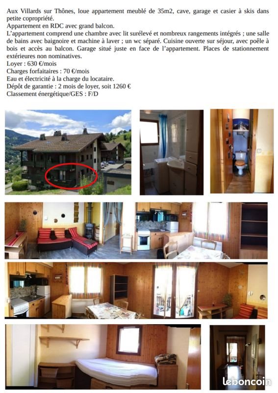 Aux Villards sur Thônes, loue appartement meublé de 35m2, cave, garage et casier à skis dans petite copropriété. Appartement en Rdc avec grand balcon. L’Appartement comprend une chambre avec lit surélevé et nombreux rangements intégrés une salle de bains avec baignoire et machine à laver un wc séparé. Cuisine ouverte sur séjour, avec poêle à bois et accès au balcon. Garage situé juste en face de l’appartement. Places de stationnement extérieures non nominatives. Loyer : 630 €/mois Charges forfaitaires : 70 €/mois Eau et électricité à la charge du locataire. Dépôt de garantie : 2 mois de loyer, soit 1260 € Classement énergétique/GES : F/D