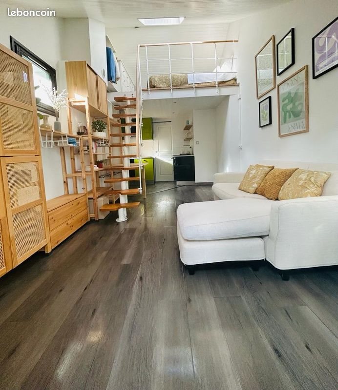 Appartement type loft avec balcon. Surface habitable 22 m2 + 8 m2 de mezzanine pour l'espace nuit. Grande pièce à vivre hauteur de plafond 4 m, avec coin cuisine (équipé : meubles, plaque induction, micro-ondes et réfrigérateur, table). Mezzanine avec lit 2 places, commode, penderie, rangements. Salle d'eau avec lave-linge, wc. Très lumineux : Sud/Ouest, avec plusieurs fenêtres. Balcon. Place de parking. Classe énergétique B: basse consommation électrique. A 15 min en bus du Rer A, station Neuville-Université. Loyer 800 E/mois + 28 E/mois charges.