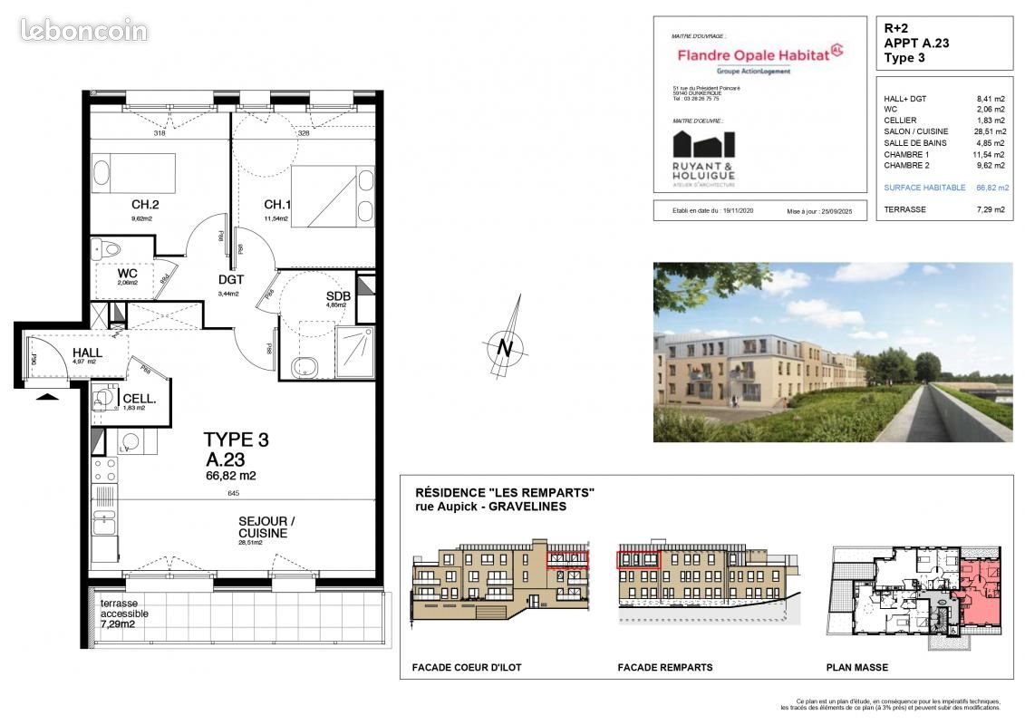 T3 neuf au cœur de Gravelines T3 neuf au cœur de GravelinesEn plein centre-ville, rue Aupick, découvrez ce bel appartement T3 neuf de 66.82 m², situé au 1er étage d'une résidence récente, sécurisée et avec ascenseur. Un cadre verdoyant, un logement lumineux et fonctionnel, parfait allier tranquillité et proximité des position :Séjour avec cuisine aménagée et équipée (28.51 m²)Chambres confortables (11.54 et 9.62 m²)Salle de douche moderne (4.85 m²)WC séparéCellier (1.83 m²)Balcon exposé plein sud (7.29 m²)Les atouts :Construction aux normes Re 2020Aucun frais d'agence ni de dossierPas de garant demandéLoyer encadréChauffage individuelService technique disponible 7j/7Cuisine et salle de douche entièrement aménagéesLoyer : 843.76 € / moisLogement soumis à des plafonds de ressources, réservé aux personnes disposant de revenus stables.Disponibilité fin janvier 2026 Référence annonce : Solo-1368