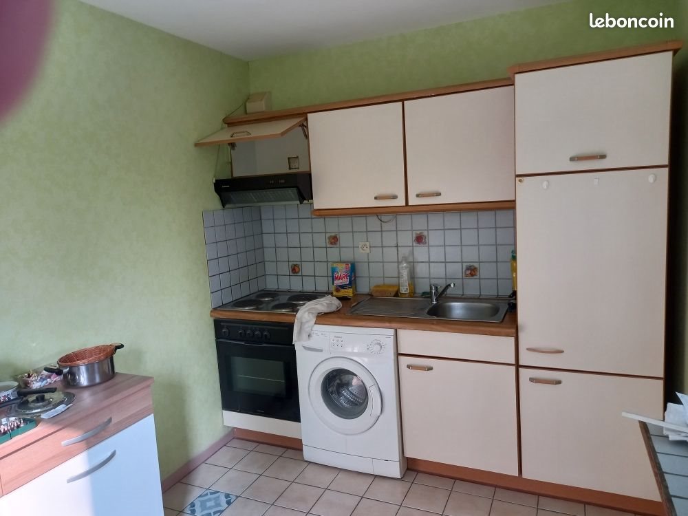 Loue F1 de 34 M² comprenant: 1 cuisine aménagée: = Meubles haut et meubles bas, 1 plaque de cuisson 4 feux, 1 hotte, 1machine à laver le linge, 1 frigidaire congélateur,1 meuble de rangement avec deux porte et deux tiroirs. 1 grande pièce comprenant:= 1 armoire moitié penderie / moitié rayonnage, 1 canapé clic-clac, 1commod blanche 6 tiroirs, 1 table noir avec trois chaises 1 salle d'eau comprenant:= 1 douche, 1 meuble lavabo avec miroir, 1Wc Prix location:= 450 euros + 60euros de charges. L'eu est comprise dans les charges. Le chauffage et l'eau chaude sont électriques à prendre en charge par le locataire