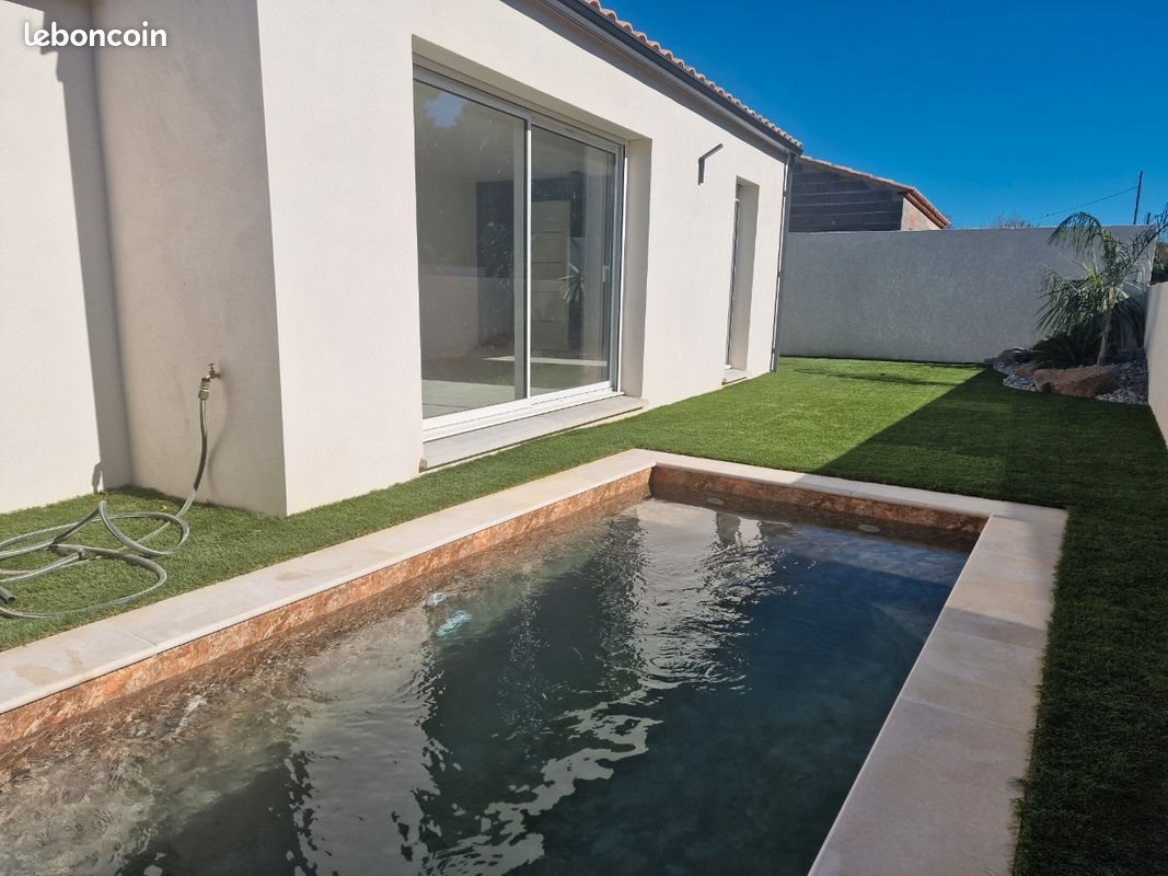Villa neuve. Quartier calme. Disponible au 1er fevrier 2026 Loyer 1100euros/ mois. Maison en cours de finissions prévues pour janvier. Orientée plein sud, elle est composée d'un espace salon cuisine ouverte d'un peu moins de 30m2 avec baie vitrée, deux belles chambres avec placards intégrés, un toilette indépendant ainsi qu'une salle de bain avec double vasques et douche à l'italienne puis un garage de 18m2 avec un accés direct à la cuisine. En extérieur, vous trouverez un jardin paysagé côté sud, est, et nord avec piscine et gazon synthétique le tout ne demandant pratiquement pas d'entretien. Vous disposerez aussi de 3 places de parking privées sur un chemin privatif. Classée Re2020. Merci de préciser votre situation lors du premier contact. Merci de votre compréhension. Cordialement.