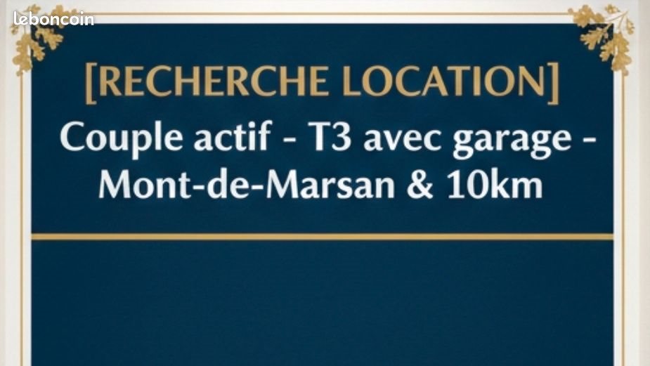 Nous sommes un couple de trentenaires (Monsieur en Cdi et Madame en multi-activités/indépendante) à la recherche d'un nouveau lieu de vie. Nous sommes sérieux, calmes et très respectueux de l'entretien des logements que nous occupons. Nos critères de recherche : Type : T3 (2 chambres minimum). Indispensable : Un garage (véhicule ou stockage). Budget : Jusqu'à 800 € charges comprises. Secteur : Mont-de-Marsan et communes alentours (Saint-Pierre-du-Mont, Bretagne-de-Marsan, Saint-Perdon, Benquet, etc.). Un dossier de garanties : Pour rassurer pleinement notre futur propriétaire, nous disposons de 3 garants (2 parents retraitéset 1 actif). Notre dossier inclut notamment un garant propriétaire de plusieurs biens immobiliers, offrant une sécurité financière et patrimoniale totale pour le paiement des loyers. Nous avons déjà constitué notre dossier de location complet (pièces d'identité, justificatifs de revenus et de patrimoine des garants) et sommes prêts à visiter rapidement. Si vous avez un bien disponible, merci de nous