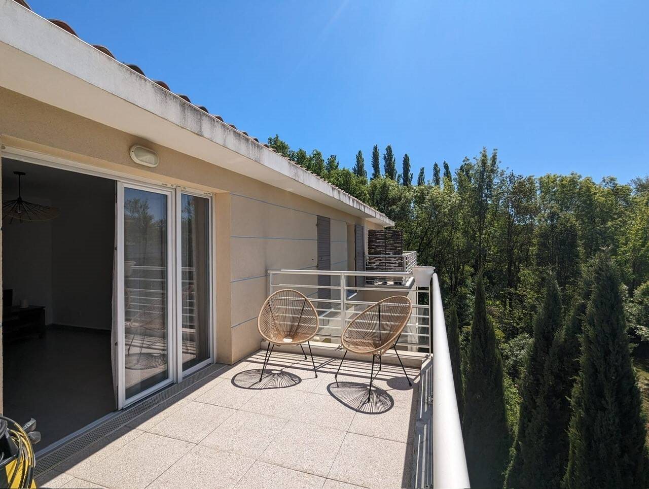 Bouc Bel Air, résidence les terrasses du Vallat, un appartement t3 meublé comprenant un séjour/salle à manger, une cuisine équipée et aménagée, deux chambres avec placards, une salle d'eau avec sanitaires ainsi qu'une terrasse. Chaudière individuelle au gaz Deux places de parking complète ce bien. Disponible le 23/01