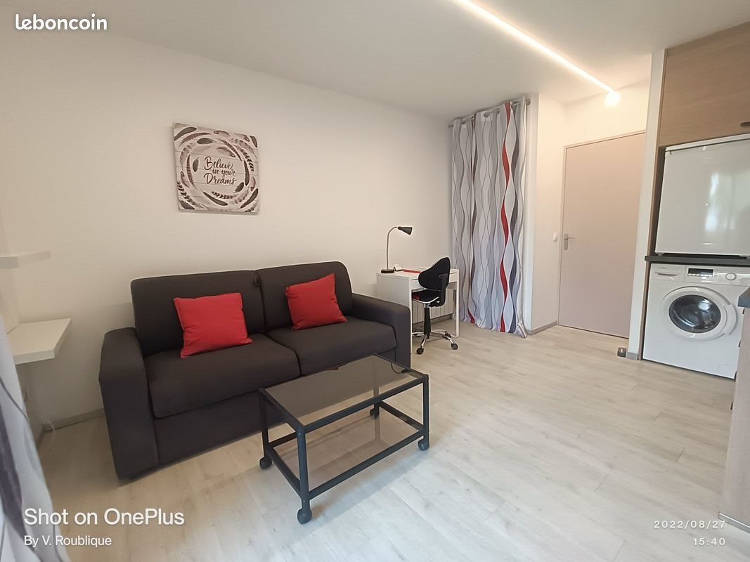 ! Uniquement pour une personne au statut étudiant (justificatif demandé) et jusqu'en juin maximum. Nous n'étudierons pas les demandes ne correspondant pas à ces critères, merci. Studio meublé, climatisé et son parking, dans agréable résidence avec piscine, à louer du 1er avril au 30 juin (bail « étudiant »), situé à Golfe Juan (proximité Juan les Pins), proche de la plage, des bus et des commerces tout en demeurant au calme. Studio loué avec son parking aérien privatif. Description Detaillee : Appartement entièrement refait à neuf en 2019, il est situé dans une résidence sécurisée à Golfe Juan, à 700m de la plage, 1,2 km de la gare, 400m des lignes de bus (8-620). Il dispose d'une agréable terrasse. Il comprend 1 canapé lit deux places (système Rapido, facile d'ouverture, matelas épais), 1 lit superposé, une table basse, une table rabattable, un bureau avec sa chaise, 4 chaises pliantes, et de nombreux rangements. La cuisine est équipée d’un réfrigérateur avec compartiment congélation, d'un lave-vaisselle, d'un lave-linge, d'une plaque de cuisson vitrocéramique, d'un four et d'un four micro-ondes, ainsi que du petit électroménager (cafetière, bouilloire, grille-pain) et tout le nécessaire en termes de vaisselle et accessoires. Une télévision écran plat et une box fibre (Internet/TV) complètent son confort. L’Appartement, situé au 1er étage, est accessible par ascenseur. Le parking privatif, aérien, est à l'intérieur de la résidence, à proximité immédiate de l’entrée de l’immeuble. Situation : Golfe Juan est une agréable station balnéaire située entre Cannes et Antibes, avec un port de pêcheur et un port de plaisance bordé de nombreux restaurants. À 8km de Sophia Antipolis. À 6km de Cannes (liaison directe par Ter). À proximité immédiate de Juan Les Pins. À 18km de l'aéroport de Nice. À 5km de l'autoroute A8. Les conditions : Location du 1er avril à juin pour étudiant. Loyer mensuel de 575€ + forfait mensuel de 45€ de charges (eau 5m3/mois, box internet/TV, charges de copropriété, taxe d’ordures ménagères). Contrat d'électricité à prendre indépendamment (frais d’ouverture, abonnement mensuel et consommation électrique). Le studio sera à nouveau ouvert à un bail étudiant de septembre 2026 à juin 2027. Non-Fumeur.