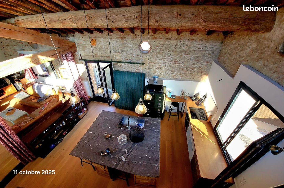 Grande chambre de plus de 12m2. Belle terrasse de plus de 18m2 exposée Est et Sud avec magnifique vue sur les Albères. Idéal célibataire ou couple sans enfant. En cœur de village, a 10 minutes de Perpignan et a 20 minutes des plages , ancienne grange rénovée en grand loft de 85m2 mêlant pierres anciennes et poutres apparentes au style atelier contemporain. Magnifiques hauteurs sous plafond pour un espace de vie lumineux et chaleureux. Une chambre à part de 12m2, cuisine ouverte sur le salon/ salle a manger, entièrement équipée (Four électrique, plaques induction/gaz, Lave-vaisselle, Four micro-ondes, grand frigo/congélateur) avec grand îlot central en pierre et bois. Doubles-Vitrages. Salle d'eau spacieuse avec grande fenêtre , douche à l'italienne et pièce dressing, Wc séparés. Terrasse en roof top de plus de 18m2 exposée plein sud offrant une magnifique vue sur la chaine des Albères. Place de parking privative devant la maison, possibilité de ranger dans le garage vélos, motos... Porte de garage automatisée. 890 électricité, eau et charges incluses. Entièrement meublé.