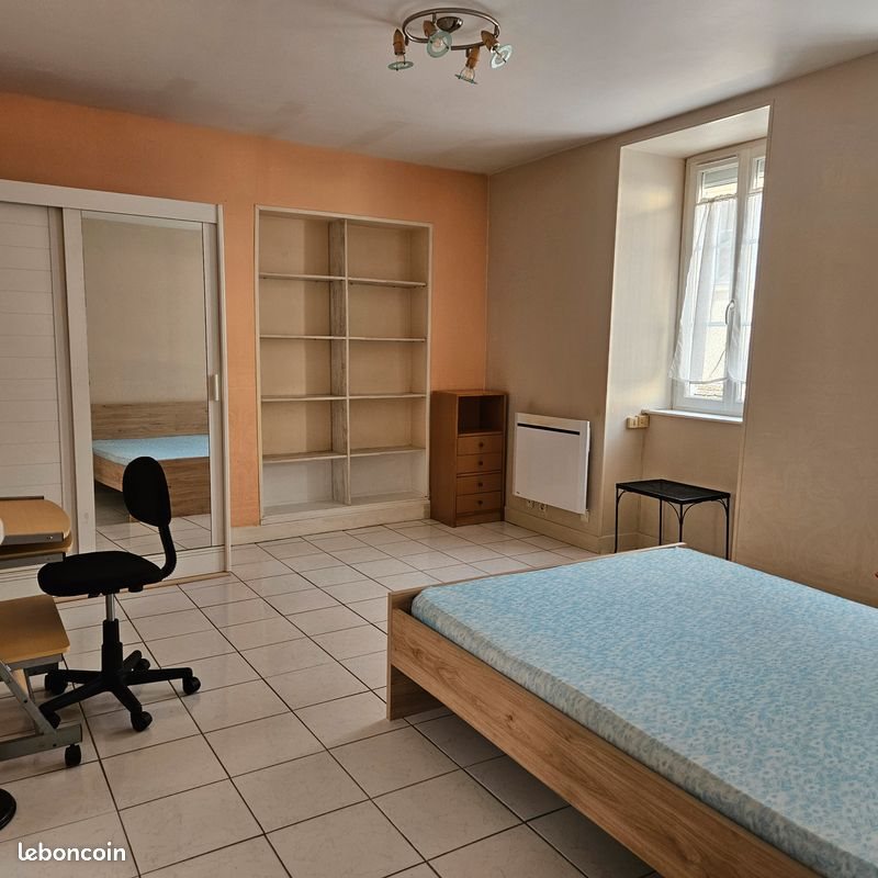 Au centre de Guéret, immeuble loué à des étudiants, proche de l'IUT. Appartement entièrement meublé, pièce à vivre, lit, armoire, bureau, cuisine équipée, salle d'eau/WC, machine à laver. 380 euros charges comprises. Wifi commun. Contact téléphonique souhaité. Gîte les Charmettes Bussière-Dunoise.