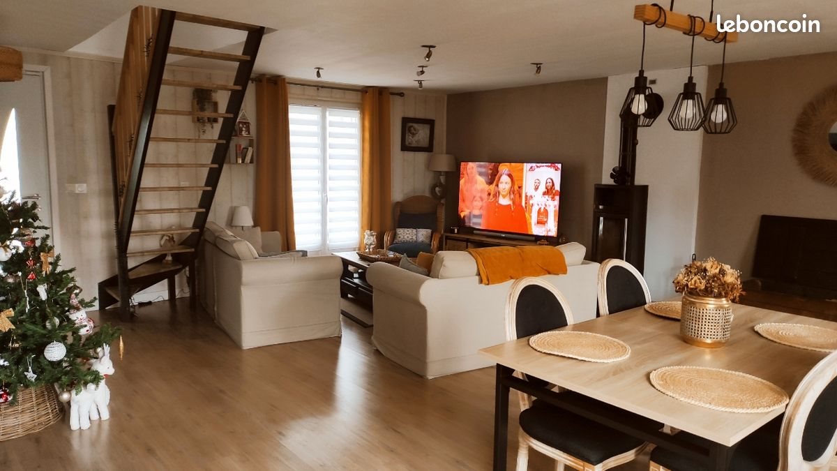 Maison de 103 m2 composée de Au rez-de-chaussée : - Belle pièce de vie de 40 m2 ouverte sur une cuisine aménagée et équipée - Wc - Salle de bains - Une chambre avec grand placard - Un garage A l étage : - Petit palier avec dressing - 2 chambres avec dressing A l'extérieur grande terrasse en bois, jardin de 700 m2 arboré et un abri de bois. Fenêtres double vitrage et volets roulants (derrière la maison). Chauffage par climatisation réversible plus poêle à bois Maison sans travaux, idéale pour une installation immédiate.
