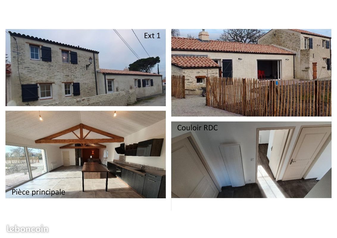 Au calme, dans un village sur le secteur de Villeneuve en Retz (Bourgneuf-en-Retz), maison de 142 m² habitables, entièrement rénovée. Extérieur avec pierre apparente et escalier traditionnel en pierre, terrasse sans vis-à-vis exposée sud, terrain de 300 m² clos, en pelouse. Au Rdc : Pièce de vie de 70 m² avec une cuisine équipée (sauf réfrigérateur) et un îlot central, ouverte sur une salle à manger et un salon, un cellier/buanderie avec placards intégrés, un Wc indépendant avec lave-mains, une chambre de 16 m² avec placards intégrés, une salle d’eau avec douche et meuble double vasque. Au 1ère étage : Une chambre de 10 m² avec entrée indépendante et une chambre de 11.4 m², une salle d’eau avec douche + lavabo + 1 Wc. Deux petites dépendances attenantes à la maison. Emplacement pour garer 2 voitures à l’extérieur. Libre à partir du 1er janvier 2026. Loyer mensuel : 1270 €, hors charges, l’entretien annuel du poêle à granules, de la Vmc et de la microstation sont à la charge du propriétaire. Chauffage par poêle à granules et radiateurs électriques avec corps de chauffe. Production d’eau chaude par chauffe-eau électrique. Assainissement autonome. Vous pouvez nous par téléphone pour plus de renseignements. Avant toute visite, merci de nous envoyer les documents suivants : - Dernier avis d’imposition - 3 derniers bulletins de salaire - Contrat de travail - Pièce d’identité - Attestation de loyer - Un mois de loyer de caution demandé