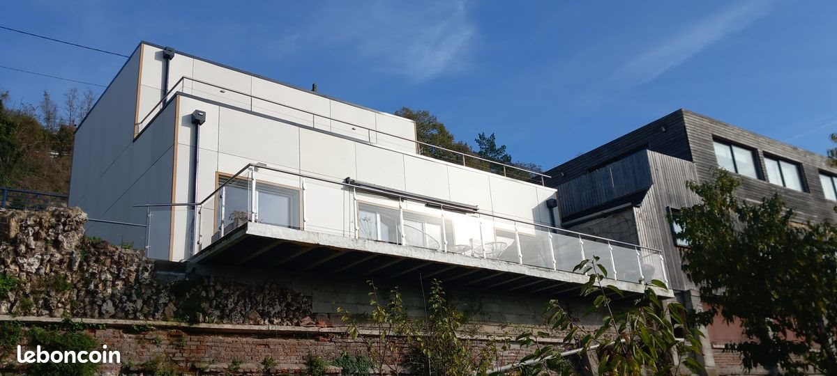 Bonjour, aux professionnels de l'immobilier, merci de ne pas me solliciter. Cette maison est construite en ossature bois avec des matériaux entièrement biosourcés hormis la dalle de béton sur laquelle elle repose au Rdc l'entrée avec dégagement permet d'accueillir un placard et dispose aussi d'un Wc, sur la droite l'escalier e colimaçon dessert les 2 chambres et la salle de bains de l'étage en face une double porte vitrée ouvre sur la pièce à vivre de presque 39m2, dans laquelle se trouve une cuisine aménagée ainsi qu'un grand placard prévu pour accueillir le lave-linge et le sèche-linge puis nous accédons à la chambre parentale à l'arrière de laquelle se trouve une salle de bains avec baignoire et wc toutes les pièces du Rdc ouvrent sur une terrasse de 33m2 qui offre une vue sur l'ensemble du sud de Rouen jusqu'à une vingtaine de km à l'étage deux chambres avec un accès à une deuxième terrasse et une salle de bains avec douche et wc sur la même parcelle de terrain bordant la rue, deux places de stationnement privatives et un portillon donnant accès à une petite partie du jardin ainsi qu'à un appentis accueillant l'atelier, la serre, les vélos et la moto de cette parcelle grâce à un escalier extérieur on accède à la partie principal du jardin (300m2) planté d'arbres fruitier, abricot, pomme, poire, prune, cerise, kiwi, coing et pêche certains arbres approchent de leur maturité mais nous récoltons r gulièrement des pêches, des cerises, des pommes, des poires et des prunes ce jardin dispose d'un abri équipé d'une chambre d'été, d'une petite salle de bain et d'une cuisine pour les Bbq pour finir, les toits (hors terrasse) sont végétalisés et supportent les panneaux solaires en autoconsommation, l'ensemble de la maison est chauffé à l'électricité et en incluant la recharge de la voiture électrique Engie nous classe dans les 5% des maisons le plus économes, les taxes foncières s'élèvent à 850euros pour 2026 n'hésitez pas à me