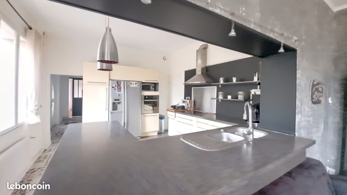 Maison individuelle batie sur 2300 m2 (jardin + parking plusieurs véhicules) Au rdc : open space avec cuisine equipée, salle de bain et chambre avec point d'eau, A l'étage 4 chambres possibilités 5 Cavz voutée Ancien garage servant de dépendance