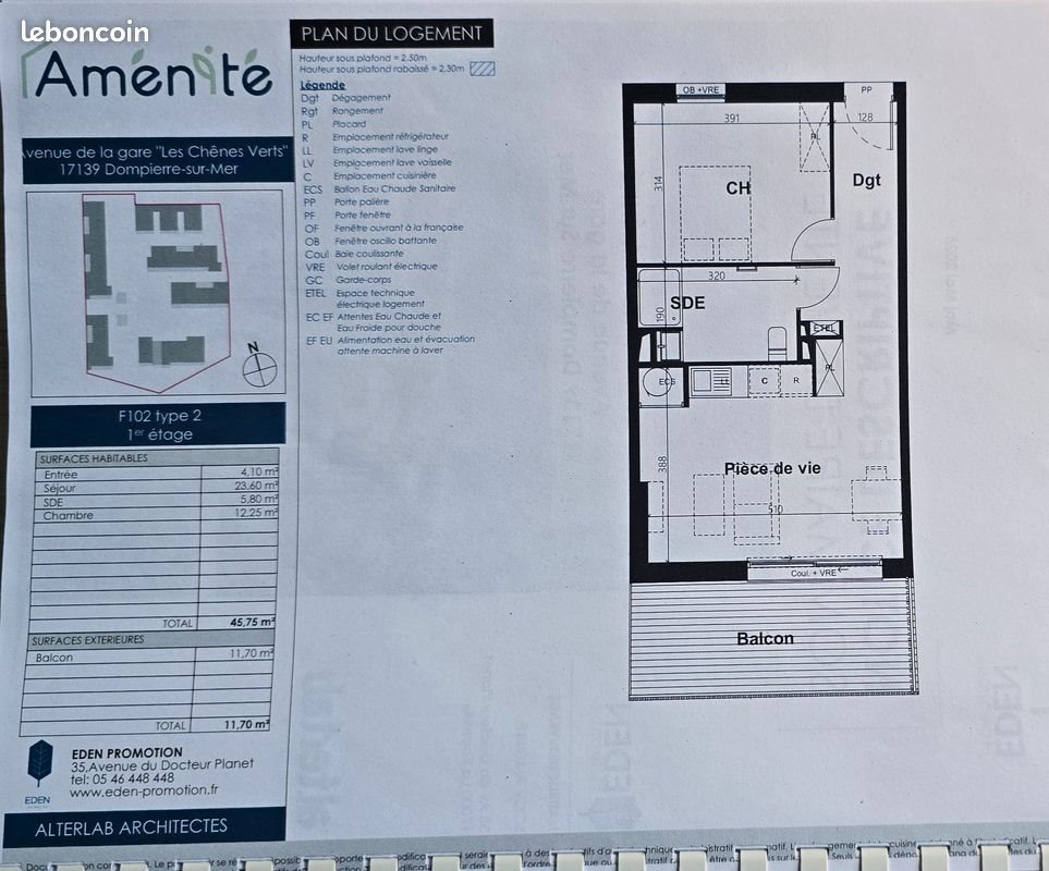 Appartement T2 meublé 46 m² - Dompierre sur Mer Au cœur d’une résidence neuve dans un cadre paisible de long du canal de Rompsay, découvrez ce superbe appartement meublé de 46 m² situé à seulement 10 min de la Rochelle en voiture ou 20 min à vélo par la piste cyclable au pied de l’appartement. Pièce de vie lumineuse exposée plein sud, cuisine équipée (four, plaque, hotte, réfrigérateur), terrasse privative de 11 m² et place de parking. La chambre est équipée d’un lit de 160, d’un dressing et d’un petit bureau. Bail 1 an reconductible tous les ans. Loyer : 720 € + 60 € de charges (eau froide, charges de copropriété, ordures ménagères) Dépôt de garantie : 1 440 €. Caution solidaire obligatoire. Disponible le . Appartement en cours d’aménagement. Photos complémentaires à venir.