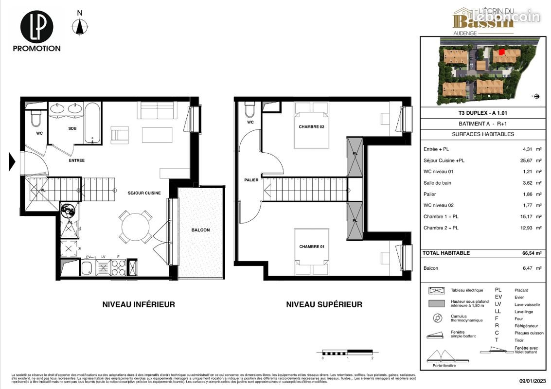 Au sein d'une résidence neuve "L'Ecrin du Bassin" à Audenge, bel appartement T3 Duplex meublé (66,54 m2), situé au 1er étage, comprenant au niveau inférieur : - une entrée + placards - séjour/cuisine + placards - Wc séparés - Salle de bain - palier - balcon 6,47 m2 Au niveau supérieur : - 2 grandes chambres avec placards - Wc séparés Exposition appartement : Est Une place de parking accompagne ce bien. Chauffage/Eau : individuel électrique. Sèche serviette dans Sdb. Logement équipé d'un thermostat dambiance. Cumulus thermodynamique individuel. Loyer mensuel : 1300 € Disponible à partir du