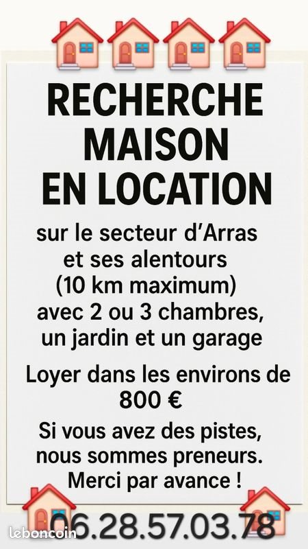 Recherche maison de 75 m² minimum sur le secteur d'Arras et ses alentours (10 km maximum), avec 2 ou 3 chambres, un jardin obligatoire et une place de stationnement. Un garage serait un plus. Loyer : environ 800 €, ne dépassant pas 950 €. Couple respectueux et propre. Nous souhaitons nous rapprocher du travail (Saint-Laurent-Blangy et Arras). Actuellement en location sur Saulty. Revenu du foyer : 3 150 €. Un Cdi, un Cdd et garantie Visale. Merci