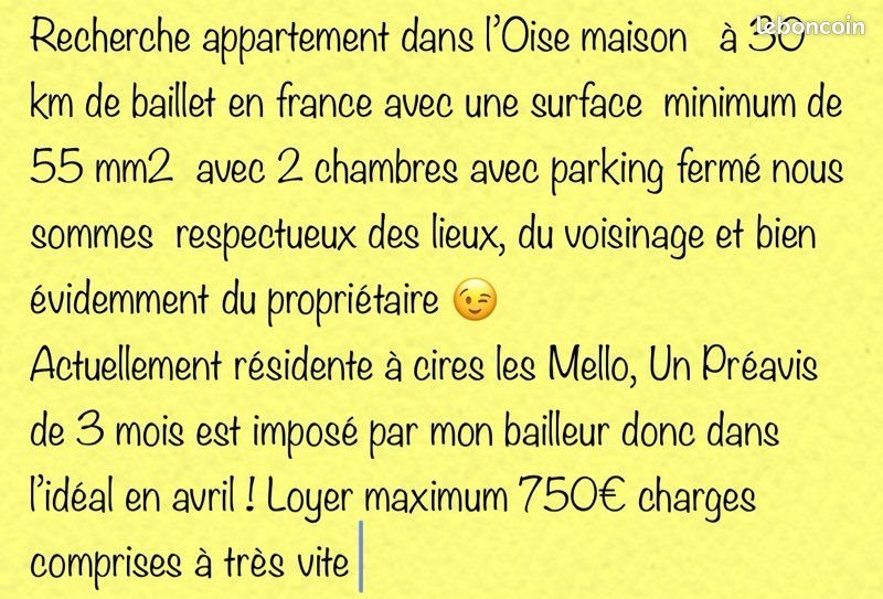Recherche appartement ou maison aux alentours de Neuilly en thelle et alentours dans l’Oise à 25/30 km de baillet en france