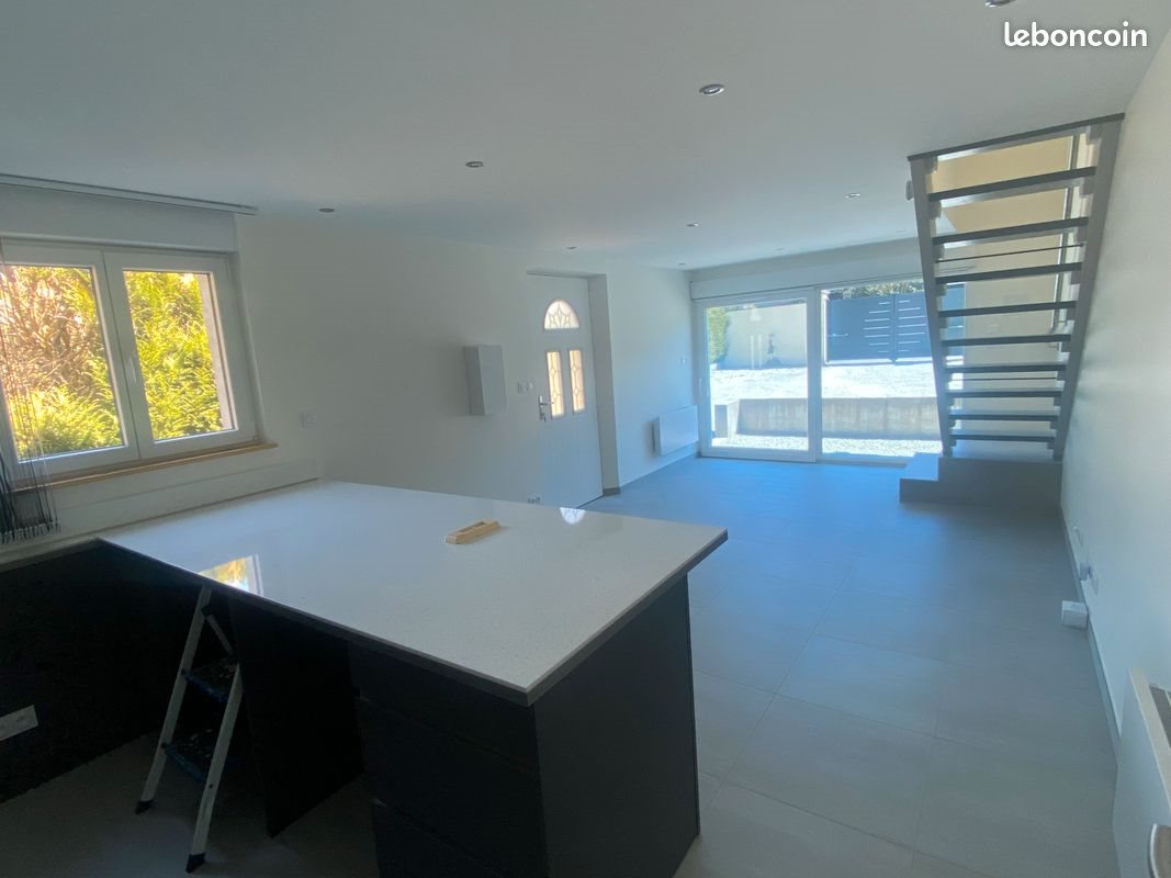 Loue T2 duplex neuf Maison mitoyenne T2 duplex neuve (2025) de 42 m² surface habitable (56 m² surface de plancher) contre maison individuelle avec entrée privée sans vis-à-vis dans propriété entièrement clôturée (portail électrique) avec cadre champêtre au-dessus de Reignier. Desservi par les navettes Proxim Iti. Au Rez grand Séjour avec Cuisine ouverte équipée neuve (îlot, plaque à induction, four électrique, évier, lave-vaisselle - emplacements disponibles pour réfrigérateur-congélateur, lave-linge & sèche-linge), Dégagement avec placard, salle de bains (douche italienne, Wc suspendu, meuble vasque et armoire de toilette), à l’Étage grande chambre avec grand placards. Terrasse privative 6 m², 2 places de stationnement dans la cour. Grande baie vitrée, fenêtre et vélux avec volets roulants électriques. Orientation principale Sud-Est. Chauffage électrique avec radiateurs à inertie et pompe à chaleur air-air réversible en climatisation. Chauffe-Eau électrique individuel. Réseau internet fibre. Dpe : C 169 kWh/m²/an & A 5 kg CO2/m²/an Loyer 900 € hors charge (eau, électricité & internet à charge du locataire). Disponible. Location de particulier à particulier (sans frais de dossier). Conditions : Caution 2 mois + mois en cours, copie pièce identité, 3 dernières fiches de salaires, et dernier avis d’imposition.