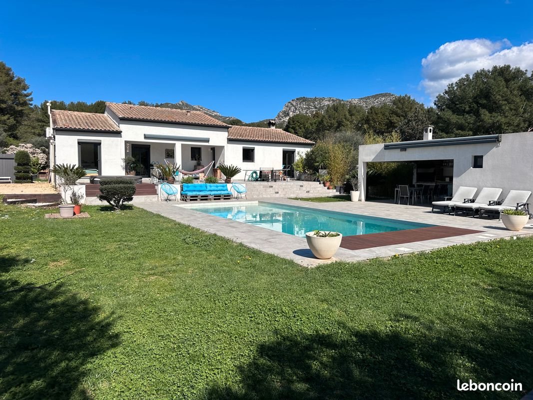 Située à Gemenos, dans un quartier recherché, plein sud, à 15 minutes de la mer, entre Cassis, Aix-en-Provence et Marseille dans un environnement calme. La maison comporte 4 chambres et une belle suite parentale. La pièce de vie se compose d'une cuisine équipée de marque Schmidt séparée par un ilot central ouvert sur le salon et la salle à manger ainsi qu’un insert. La suite parentale comporte un grand dressing de 13 m2, une salle d'eau ainsi qu'une petite mezzanine. Une deuxième salle de bain avec une baignoire balnéothérapie "Jacob Delafon" vient compléter le tout. La maison dispose d'une cave et d'un vide sanitaire accessible. Deux portails, un au nord et un au sud, permettent de garer plusieurs voitures sur des espaces dédiés aménagés. Le terrain plat de 1000 m2 est exposé plein sud et dispose d'un jardin paysagé avec muriers et framboisisers. Pensé pour une vie estivale tout confort l'extérieur aménagé est l'atout principal de cette maison. Elle dispose de plusieurs espaces de vie extérieurs dont une terrasse de 100 m2 et un pool-house de 46 m2 comportant une cuisine équipée de 25 m2 avec un barbecue argentin, plaque, micro-ondes, lave-vaisselle. La piscine, de 4,5 mètres sur 10 mètres, maçonnée, est traitée au sel et régulateur de Ph, et équipée d'un rideau de sécurité automatisé. Le jacuzzi extérieur dispose de 5 places dont une allongée. Un terrain de pétanque permet de prolonger les journées d'été jusqu'au soir. Un abris de jardin permet de ranger vélos, tondeuse, etc. Un local technique de 21 m2 qui dispose d'un Wc séparé permet beaucoup de rangement (bricolage, coussins, etc...) Un poulaillé au nord est toujours en place et peut être utilisé ou démonté facilement. Taxe foncière : 1966,00 euro. Agence s'abstenir !