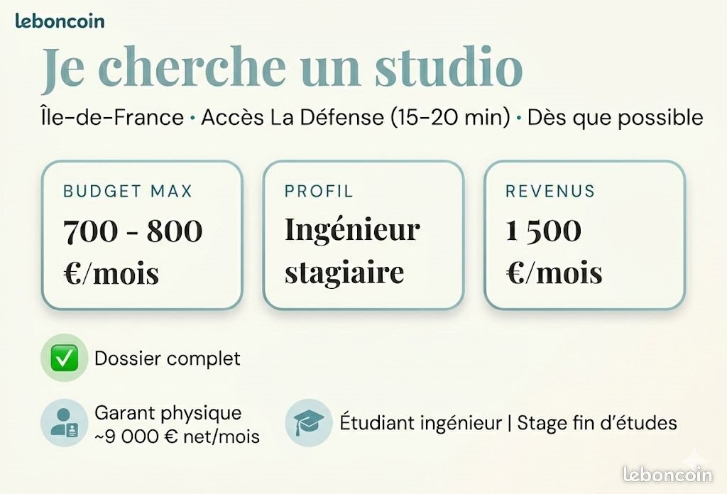 Recherche d'un studio/T1 d'environ 20m² dans la région Île-de-France. Budget de 800€/mois maximum. Etudiant ingénieur de fin de cycle, stage de fin d'études (~1500€/mois). Garant physique (~9000€/mois). Dossier complet disponible via DossierFacile. Le logement doit : - être à environ 20/30 minutes maximum de La Défense via transport en commun (RER/Métro/Tram/Train). - être sécurisé (interphone et digicode). - avoir la fibre. - avoir une prise pour machine à laver (si non meublé). Dès que possible. N'hésitez pas à me .