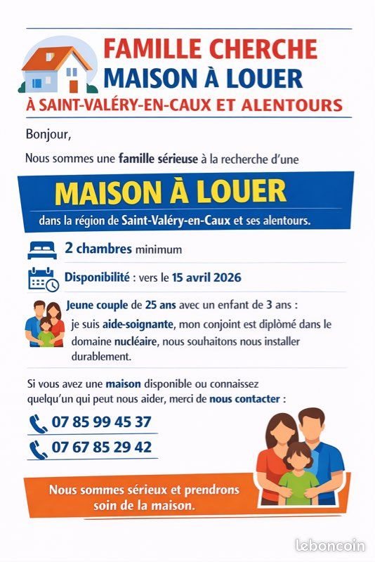 Bonjour , Madame , Monsieur, J’espère que mon annonce ne dérange pas. Nous recherchons un logement à louer aux alentours de Saint-Valéry-en-Caux. Aux alentours des centrales nucléaires, usine et établissements de santé on a pas vraiment de villes ou villages où on veut habiter.? On recherche une maison avec deux chambres minimum, avec un jardin , loyer max 900 euros , sa serai pour mi avril vers le 15 avril. Le reste sera du plus mais au minimum une maison avec cours avec 2 chambres. On a pas d’exigences pour l’année de construction, ni pour la classe énergétique, ainsi que le moyen de chauffage. Nous sommes un jeune couple de 25 ans avec un enfant de 3 ans. Même si nous avons tenté l’aventure en Bretagne pour un projet professionnel de mon conjoint, nous restons profondément Normands et souhaitons revenir vivre dans notre région d’origine, là où nous avons vécu auparavant et où notre famille habite.? Je suis aide-soignante, mon conjoint a toute ces habilitations nucléaires et il est échafaudeur diplômé et il a le niveau bac Mei pour faire Agent de maintenance. Hésitez pas à nous ☺️ Merci beaucoup pour votre aide et vos partages ! ?