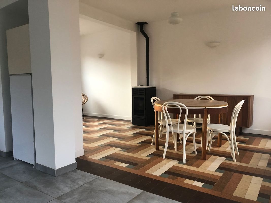 A Louer Maison Meublée années 50 entièrement rénovée 885 euros. Si intéressé Merci de remplir le dossier locataire. Maison une mitoyenneté située dans rue calme de Marquillies. Gare Sncf 10 minutes à pied. 75 m² habitables avec 2 chambres. 1 cour de 25 m². 1 parking 1 voiture devant la maison. 1 sous-sol de 38 m² pouvant servir de buanderie, de cave ou d’espace de stockage (porte du garage très étroite). Toutes pièces de vie lumineuses avec éclairage naturel. Tous murs peints en blancs. Toutes menuiseries en Pvc double vitrage avec volets électriques. Description de la location : Entrée de la maison par un escalier. Une première plateforme de 38 m² comprenant : un hall d’entrée avec porte manteaux. Une porte dessert le sous-sol, un escalier en bois ancien dessert l’étage, une porte à galandage ouvre sur la cuisine. Une cuisine ouverte contemporaine avec placards hauts et bas contenant de la vaisselle usuelle, un four de cuisson électrique intégré et une plaque de cuisson à induction avec une hotte d’aspiration. Un meuble vaisselier d’appoint contenant les casseroles. Un réfrigérateur et un petit meuble haut d’appoint. Des ustensiles de ménage et un aspirateur. La baie vitrée de la cuisine ouvre sur un escalier extérieur descendant vers une cour fermée aménagée avec sol en cailloux et bacs pour plantes. Un espace salle à manger/salon ouvert et traversant au carrelage vintage préservé : la salle à manger avec vue sur cour comprend une table ronde et quatre chaises, un large buffet de rangement, un radiateur électrique. Le salon avec vue sur la rue comprend un canapé, un fauteuil, une table basse, un poêle à pellets. A l’étage : Une deuxième plateforme de 38 mètres carrés, sols en bois stratifiés dans toutes les pièces, chauffage électrique : une grande chambre avec un lit de deux personnes, une petite chambre avec un lit d’une personne, une salle de bain lumineuse avec une grande douche à l’italienne, un lavabo avec miroir, un Wc, un porte serviette électrique et un grand meuble de rangement. Un petit espace de renfoncement avec étagères ouvert qui peut servir de bureau ou autre fonction à définir. Date de réalisation du diagnostic énergétique 9 décembre 2025. Dépôt de garantie : deux mois de loyer