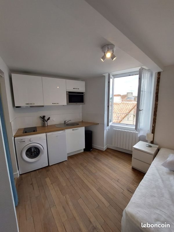 Loue studio de 13m2 meublé et équipé au 1er étage d’un immeuble restauré en plein cœur de Montmorillon à proximité immédiate des commerces. Pièce à vivre claire avec coin cuisine équipée de plaques, hotte, micro-onde/grill, réfrigérateur, coin repas avec table et 2 chaises, vaisselle complète, commode, armoire, lit, lave-linge. Salle d’eau avec lavabo, douche et Wc. Chauffage électrique. Refait à neuf, très bien isolé, doubles vitrages. Loyer 330 euros / mois + 20€ de charges incluant ménage & électricité des parties communes + internet. Parking à proximité immédiate. Local vélos.