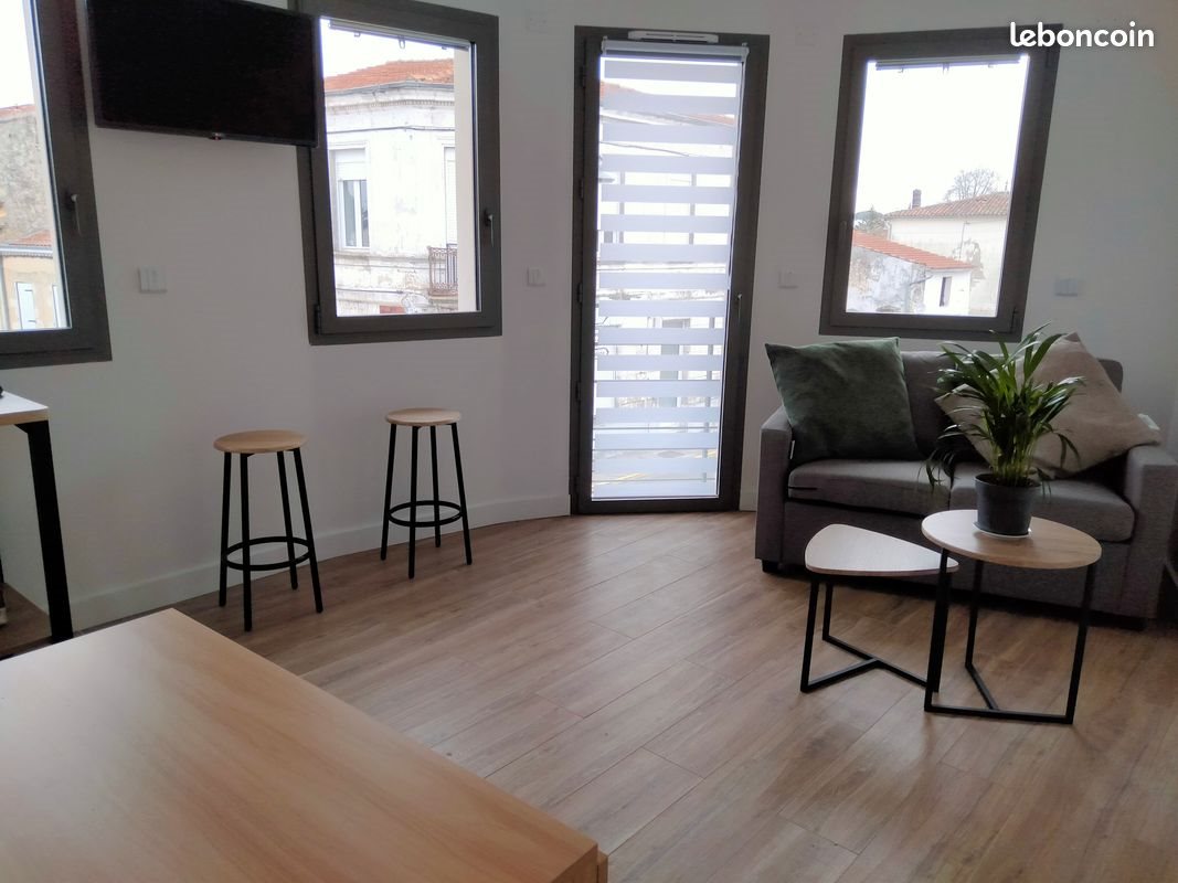 A louer studio neuf a 200 m de la clinique de Lesparre Medoc. Très lumineux, clim réversible. Entièrement équipé, lave-seche linge, Tv connectée, machine à café, robot cuiseur... Sdb avec grande douche italienne, sèche serviettes. Couloir entrée avec dressing et rangements (manque sur les photos tapis de sol, rideaux, plante etc...) Dépense énergétique annuel très faible (photo)