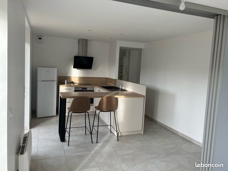 Loue studio centre de Bouvron Appartement refait à neuf Chambre avec cloison japonaise Cuisine aménagée : plaque hotte four frigo Sdb douche extra plate meuble vasque miroir Wc Machine à laver Grand balcon Cave Accès digicode Premier contact par mail