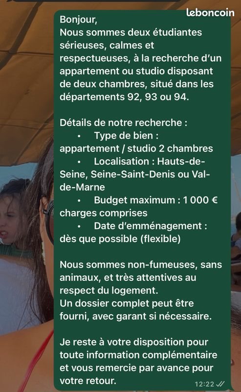 Bonjour, Je me permets de vous dans le cadre d’une recherche de logement. Nous sommes deux étudiantes sérieuses, calmes et respectueuses, à la recherche d’un appartement ou studio disposant de deux chambres, situé dans les départements 92, 93 ou 94. Détails de notre recherche : Type de bien : appartement / studio 2 chambres Localisation : Hauts-de-Seine, Seine-Saint-Denis ou Val-de-Marne Budget maximum : 1 000 € charges comprises Date d’emménagement : dès que possible (flexible) Nous sommes non-fumeuses, sans animaux, et très attentives au respect du logement. Un dossier complet peut être fourni, avec garant si nécessaire. Je reste à votre disposition pour toute information complémentaire et vous remercie par avance pour votre retour.
