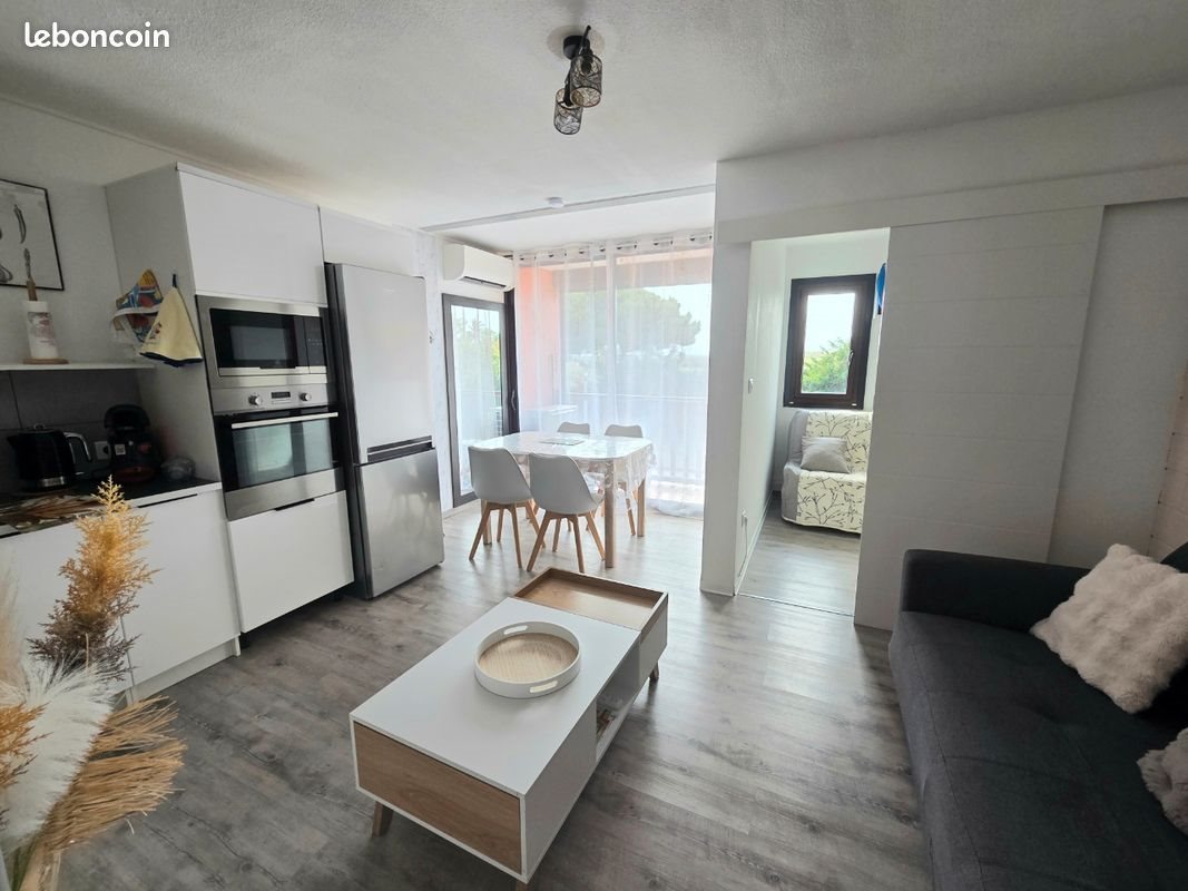 Bonjour, A louer de Mars à fin Juin. Appartement lumineux, situé dans une résidence arborée & sécurisée avec gardien. En extérieur, vous trouverez 2 piscines pour petits & grands ainsi qu'1 boulodrome. En intérieur, le logement dispose de la clim, d'1 chambre avec 1 lit en 140, 1 salon avec balcon, 1 canapé-lit convertible, 1 cuisine toute équipée avec lave-vaisselle. Côté nuit, vous aurez 2 lits superposés, 1 lave-linge ainsi qu'1 salle d'eau. Le petit + : l'appartement est idéalement situé à proximité des plages & des commerces.