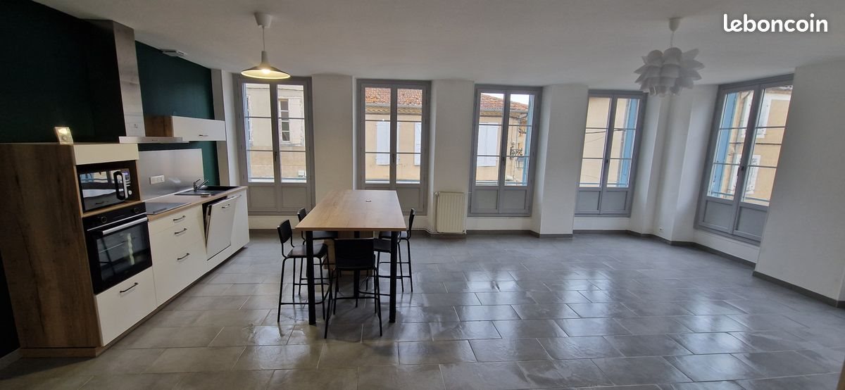 A louer grand appartement entièrement refait très lumineux situé au 1er étage d'un immeuble de 4 logements dans le centre ville de Mirande. Il se compose d'une grande pièce à vivre avec une cuisine équipée, d'un couloir desservant 2 chambres, d'une salle de bain et d'un wc. Il dispose d'un local à vélo sécurisé, d'un interphone et de la fibre. Il se situe à 20m d'un grand parking.