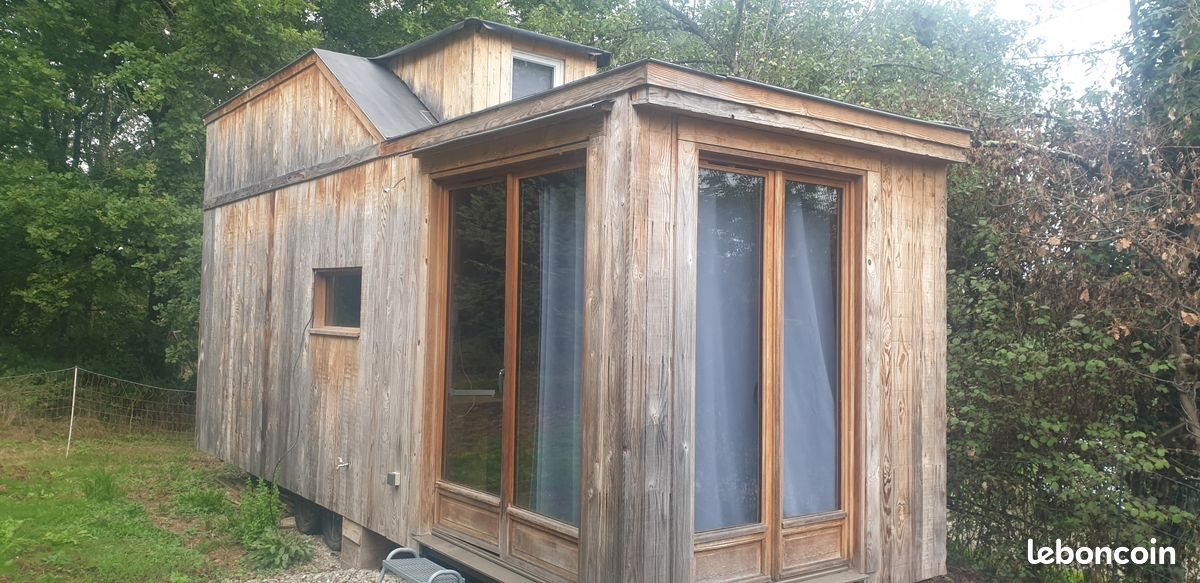 Tiny house 8x2,20m. Hauteur 4m. Construite il ya 4ans, facture à l'appui. Connexions pour eau et électricité faites. 2 pièces en bas et une pièce sous mezzanine supplémentaire accessible avec un escalier. Se déplace avec un plateau. Ne peut pas rouler. Merci