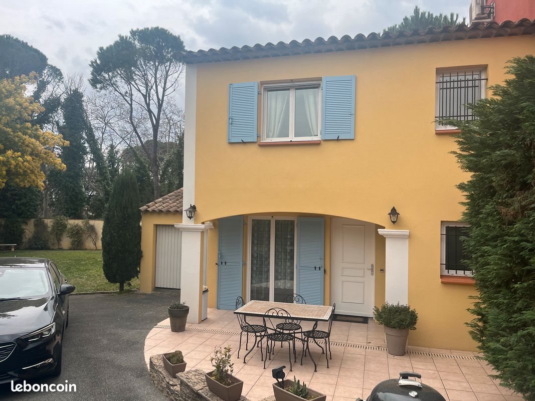 Maison mitoyenne d'un coté avec garage . Cuisine équipée ( four,micro ondes ,plaque induction ,lave vaisselle ) séjour+ cuisine 40 m2) , 2 chambres ,grand bureau avec placards, salle de bains avec baignoire , salle d'eau , 2 wc . Climatisation. Jardin +2 terrasses . Libre le 20 avril 2026 .