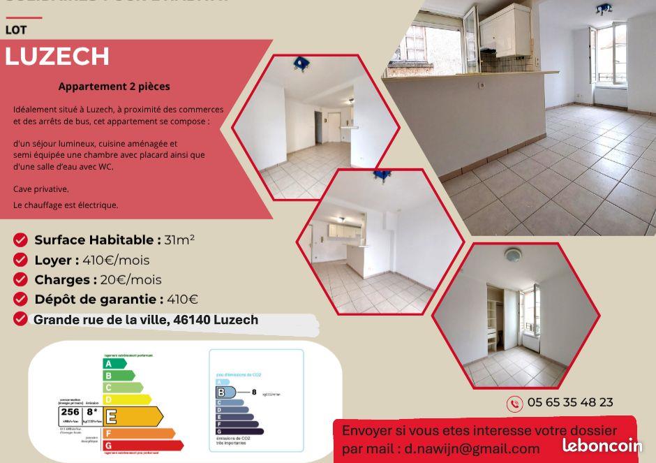 Petit appartement à louer idéalement situé à Luzech, à proximité des commerces et des arrêts de bus, cet appartement se compose Un séjour lumineux, cuisine aménagée et semi équipée, une chambre avec placard ainsi que d'une salle d'eau avec Wc. Surface habitable 31 m2 Loyer 410 € par mois Charges 20 € par mois Dépôt de garantie 410 € Dpe : E