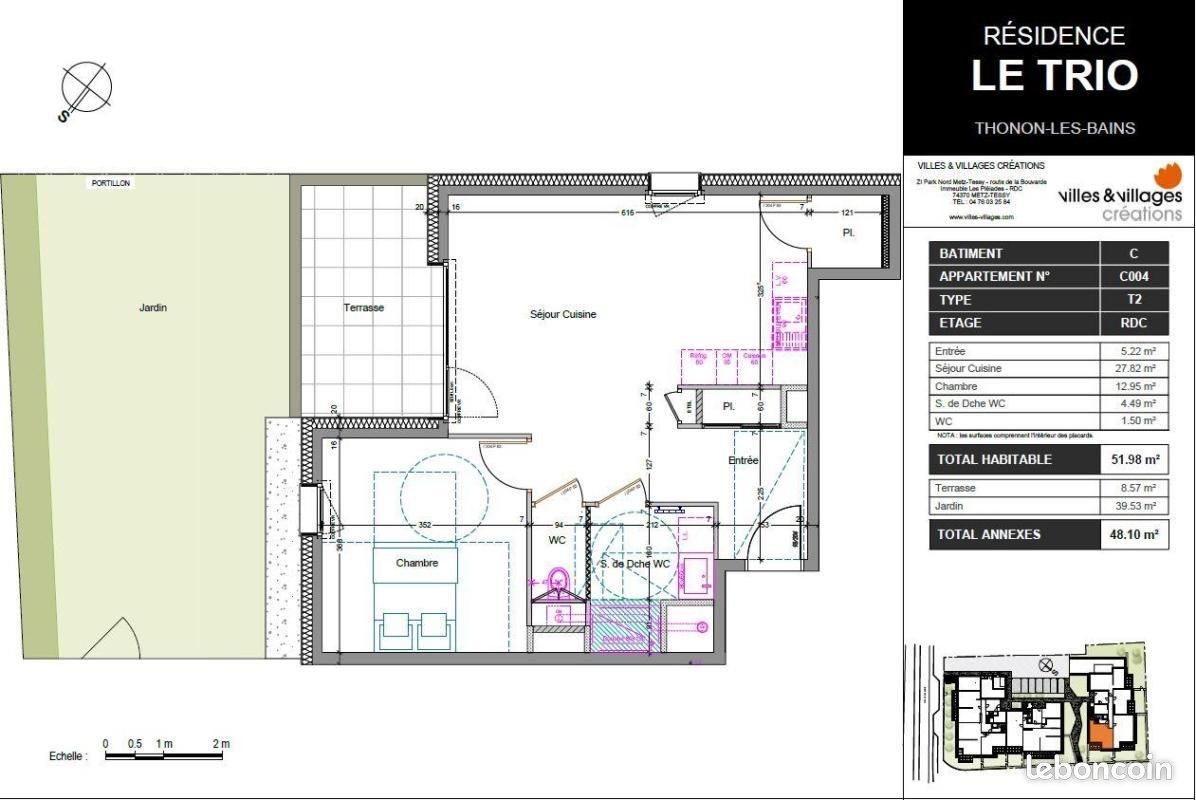 Immosquare vous propose à la location un appartement récent de type T2 à Thonon-Les-Bains, situé dans la résidence sécurisée "Le Trio", au 74 venue de Genève. Ce logement, C004, se trouve en rez-de-chaussée et offre une surface de 51.98 m². Il se compose d'une entrée avec placard, d'un séjour lumineux avec cuisine équipée donnant accès à une terrasse L'appartement dispose également d'une chambre avec placard et d'une salle d'eau et wc séparé. Un garage vient compléter cette location en sus à 80euros et en sus également un dépôt de garantie pour ce garage à 80euros. Disponible le Renseignements et Contact : Service location [Coordonnées masquées] Dépôt de garantie : 1638.00€ Les honoraires charge locataire sont de 681.98 euros (soit 13.12 euros/m² ) dont 157.50 Euros pour état des lieux ( soit 3.03 euros/m² ). Montant estimé des dépenses annuelles d'énergie pour un usage standard : entre 512 et 693 euros. Prix moyens des énergies indexés en 2023. Les informations sur les risques auxquels ce bien est exposé sont disponibles sur le site Géorisques : Référence annonce : Lapp101485 Date de réalisation du diagnostic : Honoraires à la charge du locataire : 681 € Ttc dont 157 € pour l’état des lieux Montant des charges : 80 € / mois Montant estimé des dépenses annuelles d'énergie pour un usage standard : entre 512 € et 693 € sur les années 2021, 2022 et 2023 (abonnements compris).