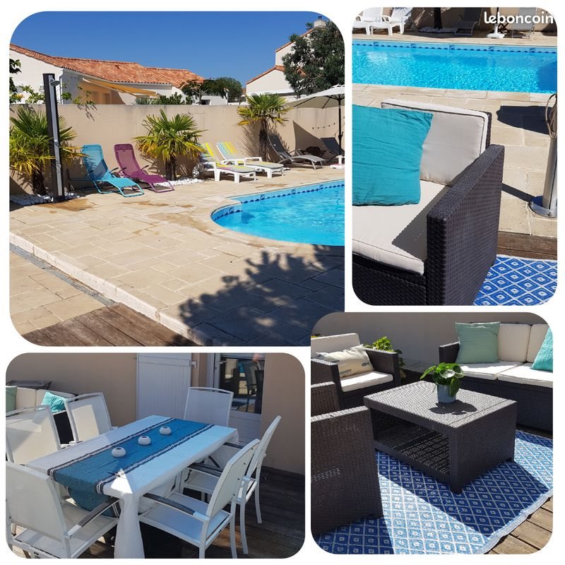 Particulier loue maison de vacances de 124 m2 à 300 m du centre ville et 900 m des plages sur terrain de 574 m2 clos de mûrs avec piscine chauffée et privée comprenant une terrasse bois avec voiles d'ombrage, salon de jardin. Cuisine équipée donnant sur un coin repas avec mange debout 1 pièce de vie avec baies vitrées donnant sur la piscine. Salon - salle de bain + wc séparé 3 chambres avec placard (lits double) dont (1) de 140x200 - (1) de 160x200 - (2 lits) de 80x200 Pool House comprenant 1 chambre avec canapé lit de 160x200 (2 matelas de 80x200) Salle de bain avec douche et Wc