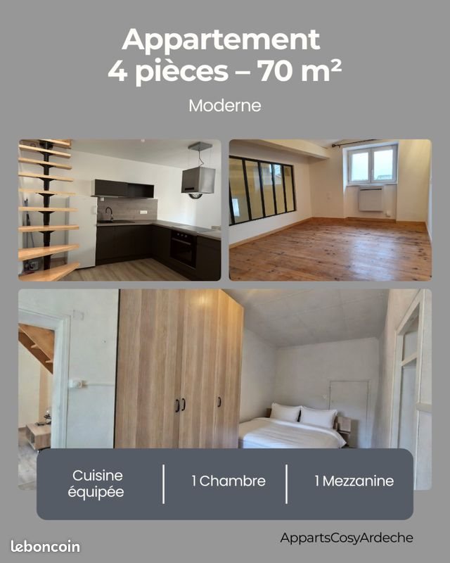 Appartement duplex avec mezzanine, meublé de 70m² au 2ème étage d'un immeuble calme de 3 logements. Le logement est composé d' : 1 Pièce à vivre de 23m² comprenant : - une cuisine équipée (four, plaque à induction, réfrigérateur) - une salle à manger ( table et 4 chaises) 1 salle d'eau avec douche à l’Italienne, vasque, Wc et rangements. Au premier étage de l'appartement : 1 salon 1 chambre de 11,90m² (lit double) 1 Mezzanine de 9,80m² pouvant servir de deuxième chambre ou de bureau Situé au sein d'un petit immeuble calme, plusieurs parkings gratuits sont à proximité. Les plus : - l'appartement a été rénové en 2022 - une buanderie individuelle (avec un congélateur) - Commerces à moins de 3 minutes à pied Et 5 min en voiture (Supermarché, pharmacie...) Loyer mensuel : 595 € charges comprises (incluant taxe d’ordures ménagères et entretien des parties communes), auquel s’ajoute une provision pour l’eau de 45 € par mois soit 640,00€ avec la provision de charge de l'eau. Dépôt de garantie : 650€ L'appartement disponible. Bail meublé, possibilité de disposer des meubles sur place ou bien d'amener vos meubles à convenir en fonction de vos besoins. Pour plus de renseignements n'hésitez pas à nous . Premier contacte messagerie Leboncoin Un dossier de candidature vous sera demandé avant la visite. (Garants demandés)