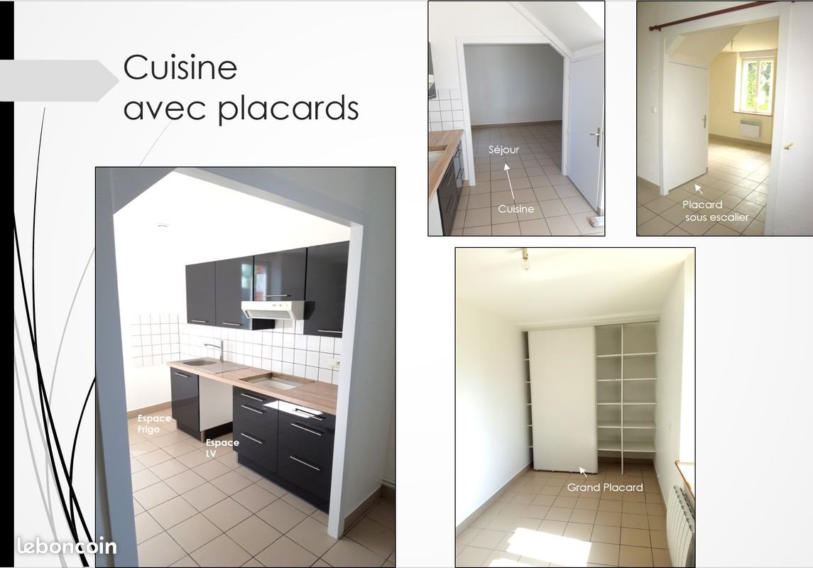 Appartement situé au 1 er Étage : 1 entrée, 1 séjour, 1 cuisine aménagée avec grands placards, 1 cellier,1 chambre avec grands placards aménagés, 1 salle d'eau, 1 Wc séparé, Au 2 nd niveau : 1 chambre avec grand placards + 1 salle d’eau avec Wc intégré Parking privé 2 voitures, chauffage électrique dernière génération, Menuiseries Pvc Double vitrage, murs doublés - Vmc. Dpe : classe énergétique: D - Ges : B - Proche commerces, supermarché, écoles et collège – Disponibilité : Actuellement disponible Loyer Mensuel : 680 € + 60 € de charges comprenant (eau - taxes ordures ménagère et entretien des espaces verts). Dépôt De Garantie : 680 € État des lieux d’entrée et de sortie réalisé par un Huissier. Il est facturé en fonction d'un coût au mètre carré : environ 3,6 € Ttc /m² de surface habitable pour chacune des parties (locataire et propriétaire). Références demandées : Cdi avec période d’essai terminée ou Retraite(E) - (Revenus : 3 fois le montant du loyers Cc) + Garants (Revenus : 4 fois le montant du loyers Cc) Visite après étude des candidatures : Informations demandées : Noms, Prénoms, téléphone, Revenus Nets avant impôts, Emploi, Nom de L’Employeur ou Remplir Votre Profil Candidat dans votre espace client Le Bon Coin.
