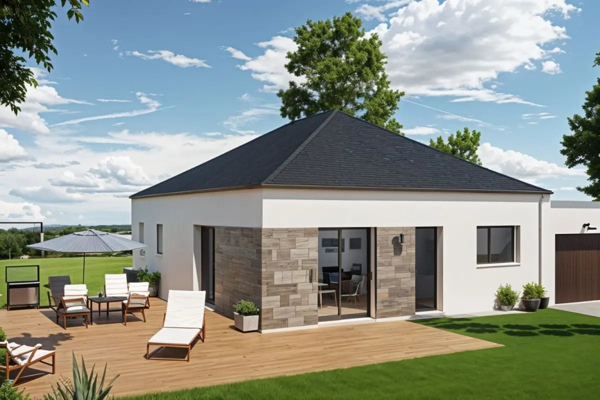 Maison plain-pied 5 pièces Découvrez cette superbe maison contemporaine en forme de « L », offrant une surface optimisée de 80 m², où confort moderne et efficacité énergétique se rencontrent harmonieusement. Vous serez séduit(e) par son espace de vie lumineux de 39 m², intégrant une cuisine américaine élégante et fonctionnelle, avec un accès pratique au garage intégré. L'espace nuit comprend trois chambres cosy, une salle de bain raffinée et des toilettes séparées, conçues pour répondre aux besoins de votre quotidien. Respectueuse des normes Re2020, cette maison associe économie d'énergie et qualité de vie, tout en s'inscrivant dans une démarche vertueuse Contactez notre agence au O2 ou au O6 (Axce's Habitat - 66 rue de la Besneraye – Za Confortland – Route du meuble 35520 Melesse). Prix incluant terrain, maison, hors frais de notaire, hors frais annexes et hors adaptation terrain. Hors aménagements intérieurs et extérieurs. Terrain sélectionné et vu pour vous sous réserve de disponibilité et au prix indiqué par notre partenaire foncier. Conditions et visuels non contractuels. Réalisation bénéficiant d'une amélioration visuelle par Ia. Découvrez tous nos projets sur notre site internet, et demandez un rdv gratuit avec l'un de nos conseillers. Cette annonce a été créée et diffusée avec le logiciel Vitahome. Référence annonce : Tmvlfe51101
