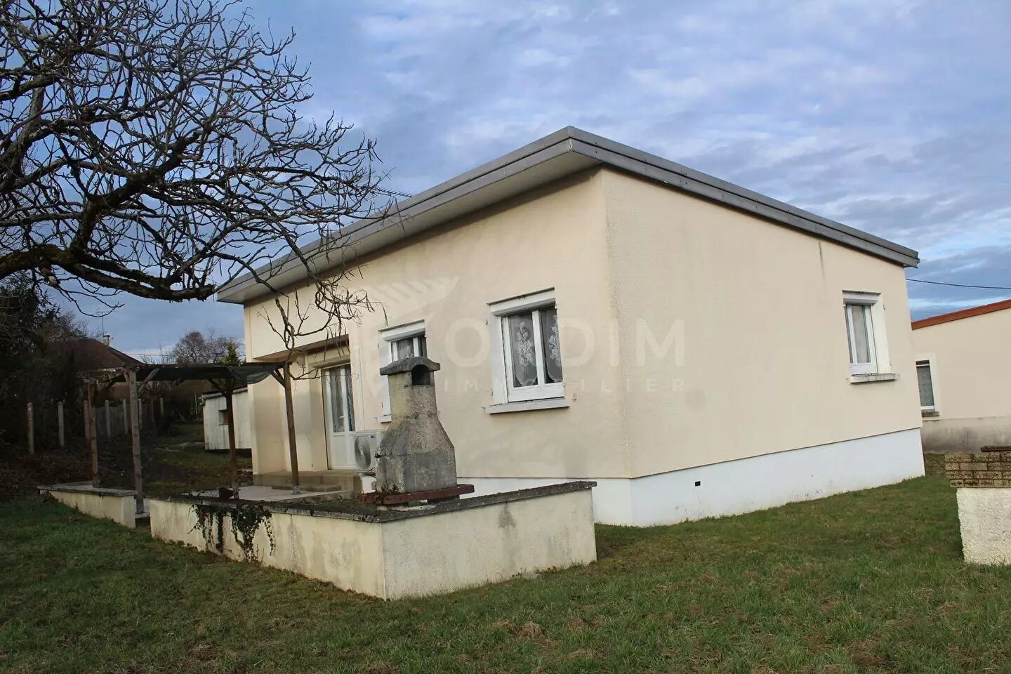 Lezinnes, maison de 4 pièces avec terrain clos et 2 garages offrant entrée, séjour donnant sur terrasse, cuisine, 3 chambres, salle d'eau, toilette, pièce. Garage de 50 m²avec portes motorisées terrain clos