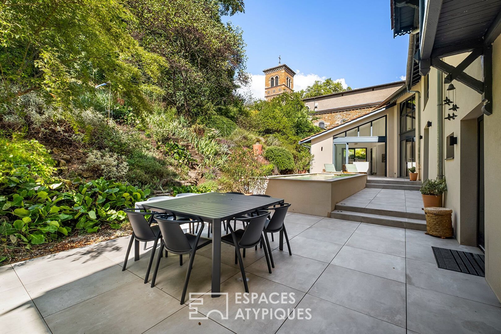 Située sur la commune de Lyon 9, dans le village de Saint Rambert, face à l'île Barbe, cette maison de caractère de 223 m² est le fruit de la rénovation par un architecte d'anciennes écuries. Elle s'élève sur un terrain arboré et bucolique de 5 000 m² et profite d'une belle terrasse avec piscine.Dès l'entrée par le grand portail, le murmure de la source et le petit bassin des carpes Koï introduisent la quiétude des lieux. Une vaste terrasse mène ensuite à la partie principale de la maison.Le hall d'entrée, dont le caractère affirmé rappelle l'histoire des anciennes écuries, bénéficie de nombreux rangements et marque une véritable transition avec l'extérieur. Une première suite avec salle d'eau prend place à ce niveau, offrant un espace nuit indépendant, idéal pour un adolescent ou des convives de passage.L'espace de vie s'organise en enfilade de plusieurs parties ouvertes. Un salon de réception, réchauffé par son poêle à granulés lors des soirées d'hiver, s'ouvre sur une grande baie vitrée laissant entrevoir la piscine et la végétation environnante. La salle à manger, idéalement positionnée, conduit à la cuisine contemporaine et design. Celle-Ci, issue d'une extension moderne, bénéficie d'une lumière traversante et d'un accès aux deux terrasses.À l'étage, la partie nuit a été entièrement repensée. Une suite parentale avec dressing et salle d'eau occupe une aile de la maison, offrant un espace intime aux parents. Deux autres chambres se partagent une salle de bains contemporaine, le tout distribué par un couloir lumineux qui conserve le charme d'antan. L'une des chambres profite d'une grande mezzanine optimisant l'espace. Une pièce discrète complète ce niveau, pouvant servir de bureau, coin lecture ou tout autre usage nécessitant tranquillité.Le jardin paysager, riche en plantations et agrémenté d'arbres centenaires, compose un véritable tableau changeant au fil des saisons. Ses dimensions très généreuses garantissent une parfaite intimité.En résumé, cette maison au cachet certain, rénovée avec des matériaux de haute qualité, offre un équilibre parfait entre vie citadine et douceur campagnarde. Véritable coup de coeur, elle se situe à proximité des commerces de Saint Rambert, de la Saône, ainsi que de toutes les commodités et des transports urbains.Cave voûtée de 17 m²Garage ferméChauffage au gaz et poêles à granulésDPE : C / Ges : CMontant moyen estimé des dépenses annuelles d'énergie pour un usage standard, indexées aux années 2021, 2022, 2023 : entre 3 160euros et 4 340 euros (abonnement compris).Contact : Céline - Celine Kannengiesser (Ei) Agent Commercial - Numéro Rsac : 949 658 371 - Lyon.