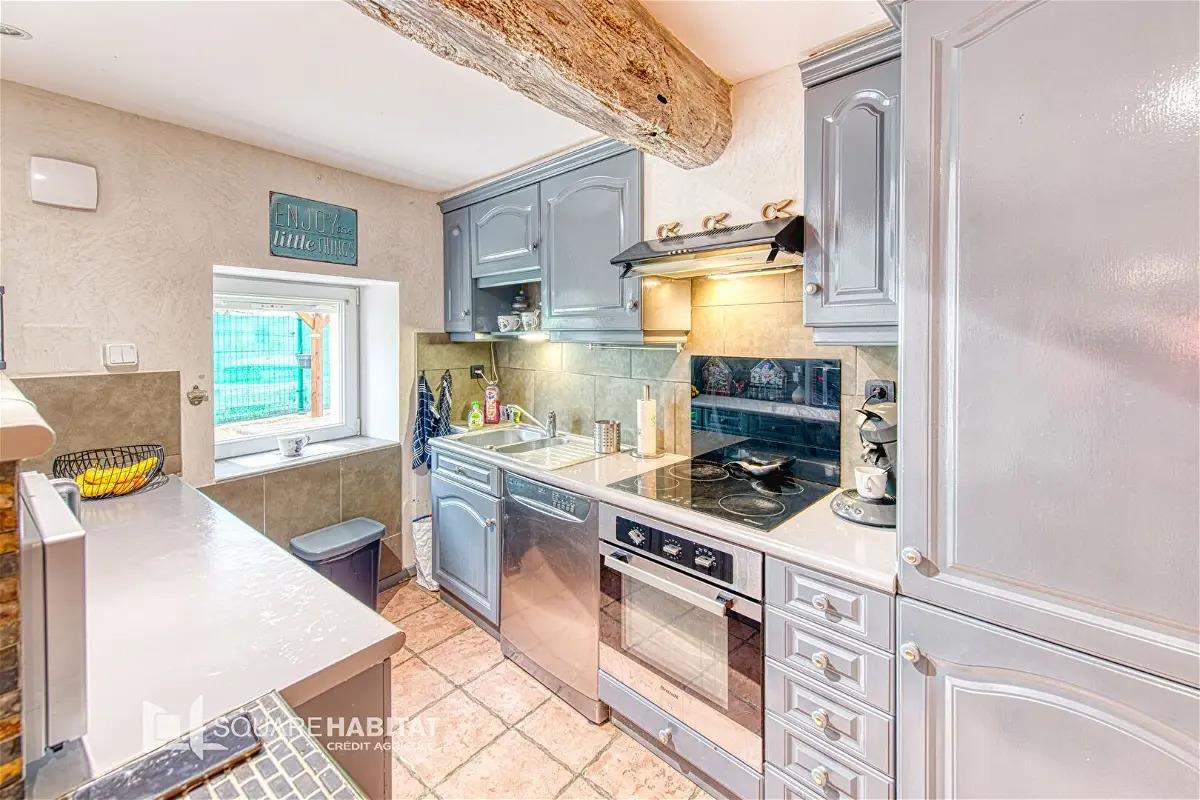 Villieu Loyes Mollon - Impasse de la Charrière - venez visiter cette maison de village T3 bis de 102 m² offrant au rez-de-chaussée : une entrée sur une grande cuisine meublée et équipée de 23 m² avec accès à une terrasse couverte de 25 m², une chaufferie / buan...